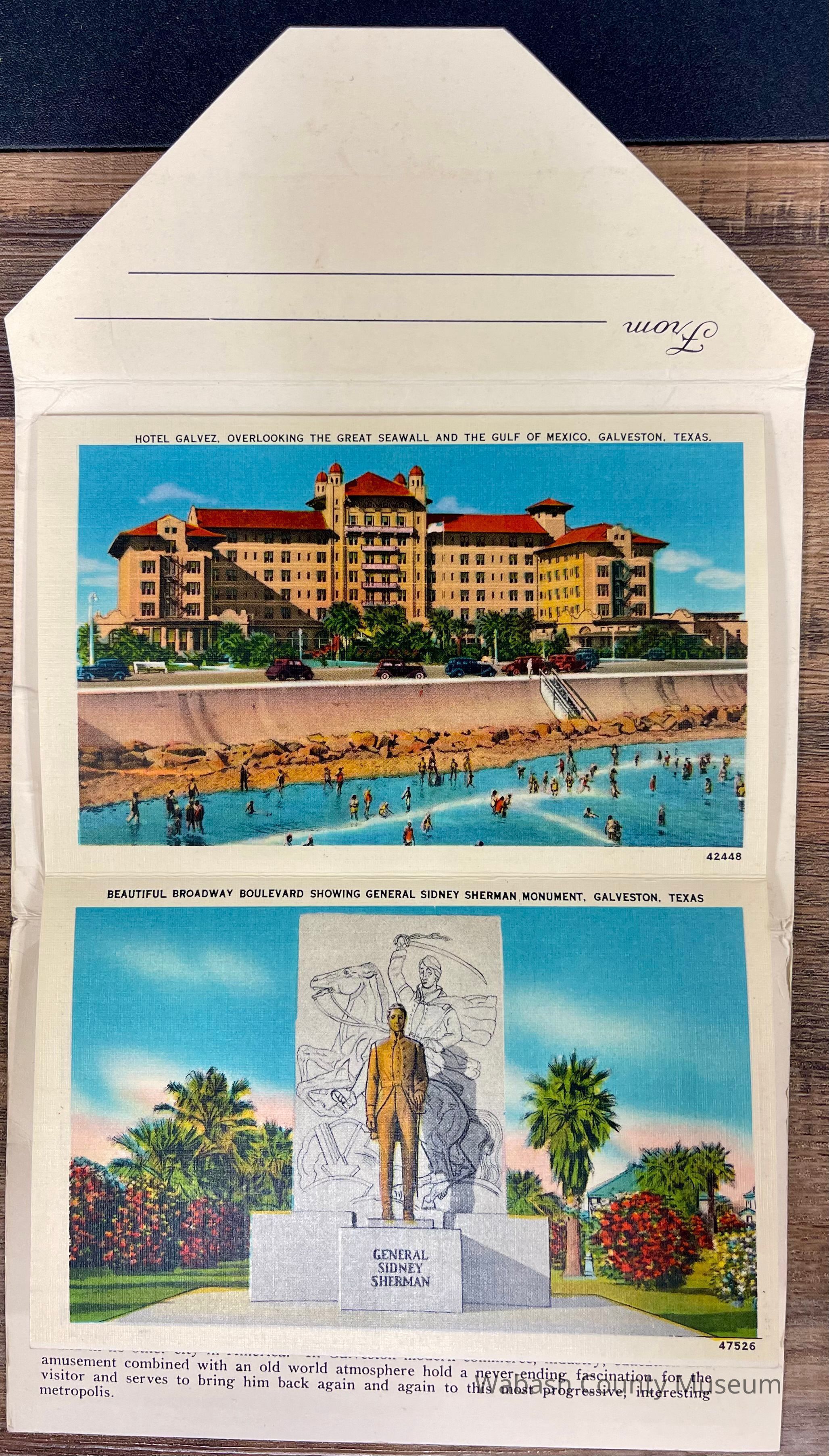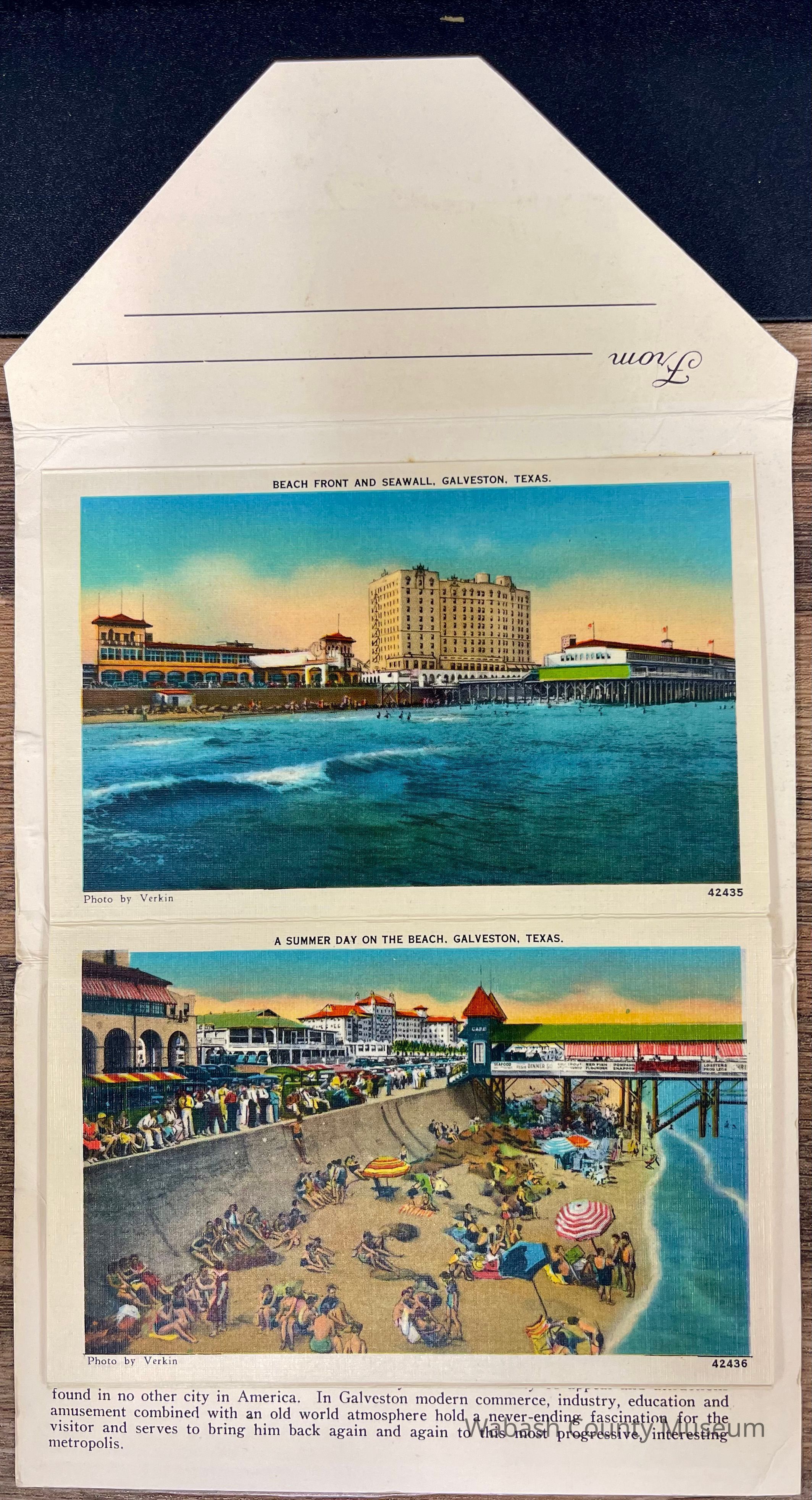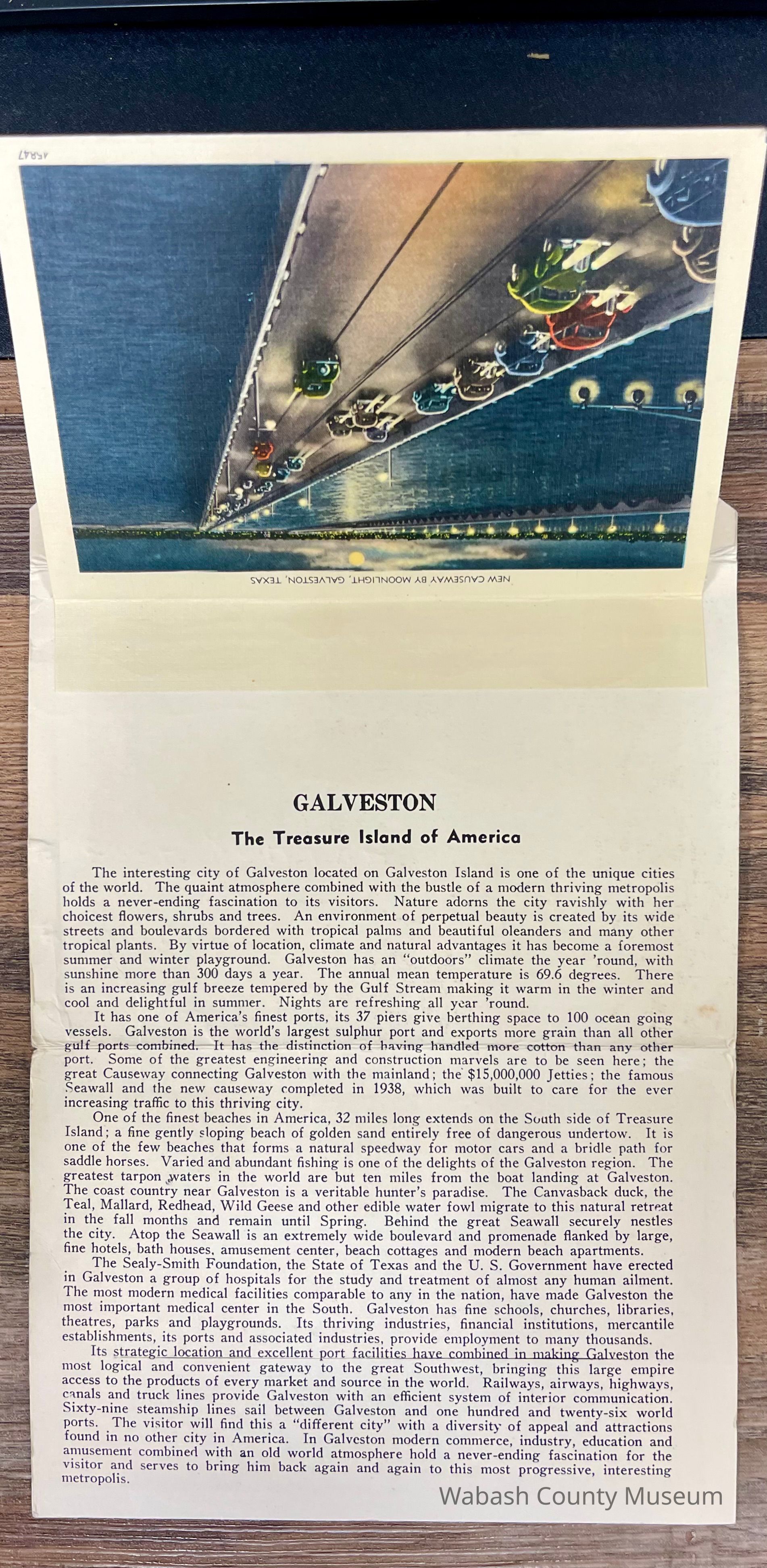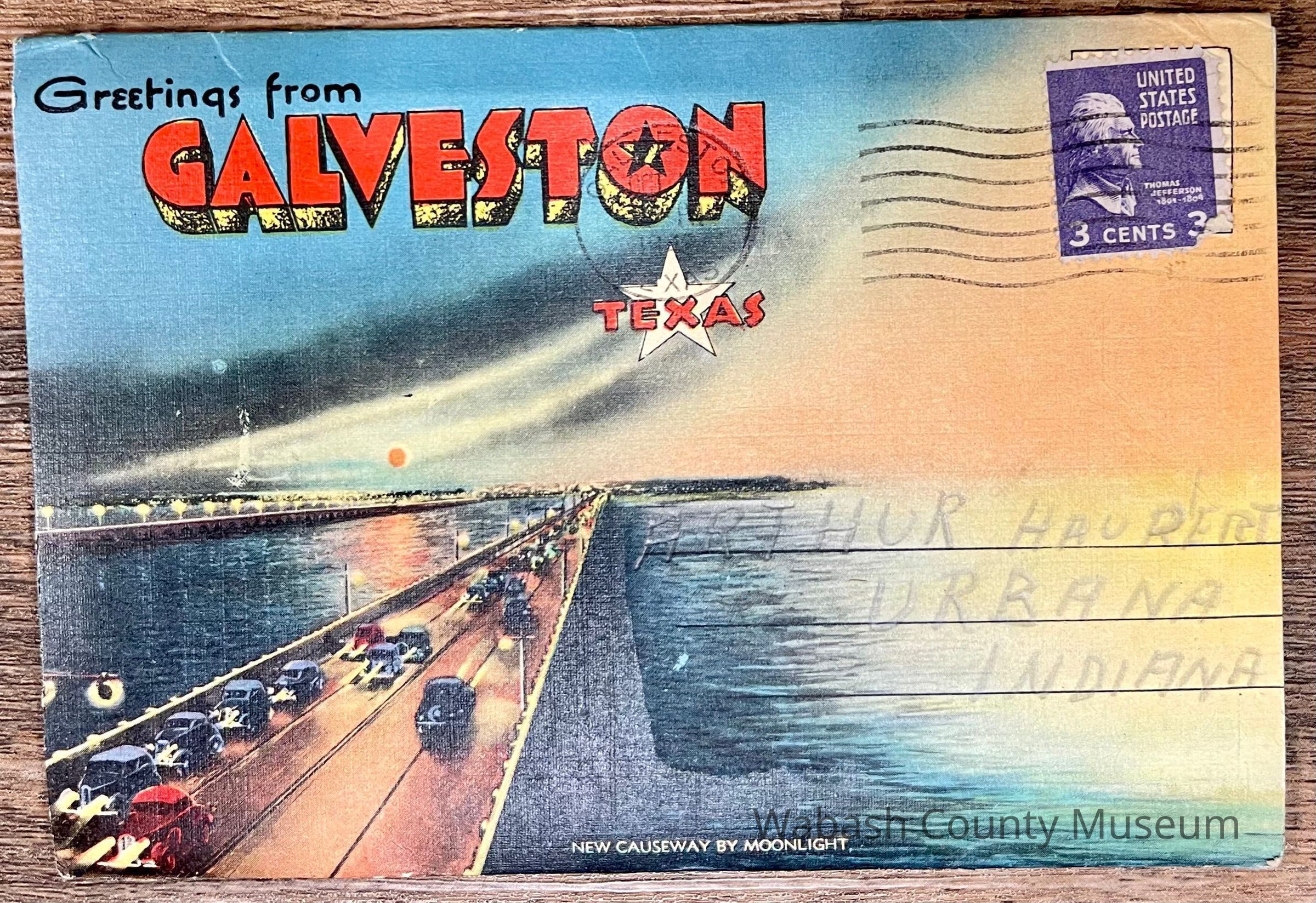 Set of Postcards "Greetings from Galveston Texas" to Arthur Haupert, postmarked Oct. 1, 1942. This is a set of ten postcards with different photographs front and back highlighting places in Galveston Texas. In addition to the postcards, on their cover, in the inside, is a description of Galveston "The Treasure Island of America" On the front of the set is a picture titled "New Causeway by Moonlight" and on the back is the "Marine Park and Million Dollar Pleasure Pier". Places represented on the postcards are: Beach Front and Seawall, Galveston Texas A Summer Day on the Beach, Galveston Texas United States Post Office, Custom House and Court House, Galveston Texas Gorgeous Oleanders in Full Bloom, Galveston Texas Steamers in the Harbor, Galveston Texas John Sealy Hospital, Galveston Texas Moonlight on the Bay, Galveston Texas We Are Making Some Good Catches on the Municipal Pier, Galveston Texas Hotel Galvez, Overlooking the Great Seawall and Gulf of Mexico, Galveston Texas Beautiful Broadway Boulevard Showing General Sidney Sherman Monument, Galveston Texas New Causeway by the Moonlight, Galveston Texas Union Station, Galveston Texas Texas Heroes Monument on Broadway Boulevard, Galveston Texas The Beach by Moonlight, Galveston Texas Fisherman's Luck is Good at Galveston, Galveston Texas Buccaneer Hotel and Seawall Boulevard, Galveston Texas Loading Sulphur at Docks, Galveston Texas Marine Park and Million Dollar Pleasure Pier, Galveston Texas St. Mary's Cathedral, Galveston Texas City Park Confederate Soldiers and Sailors Monument