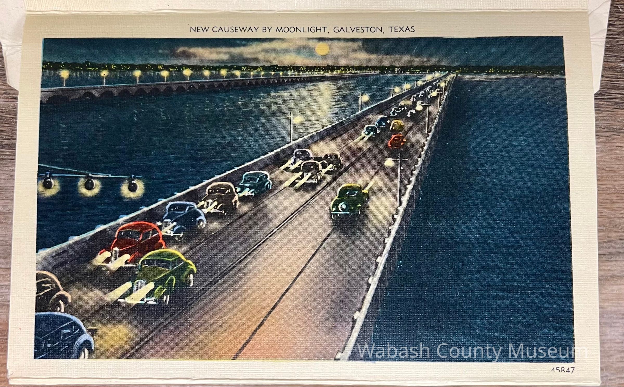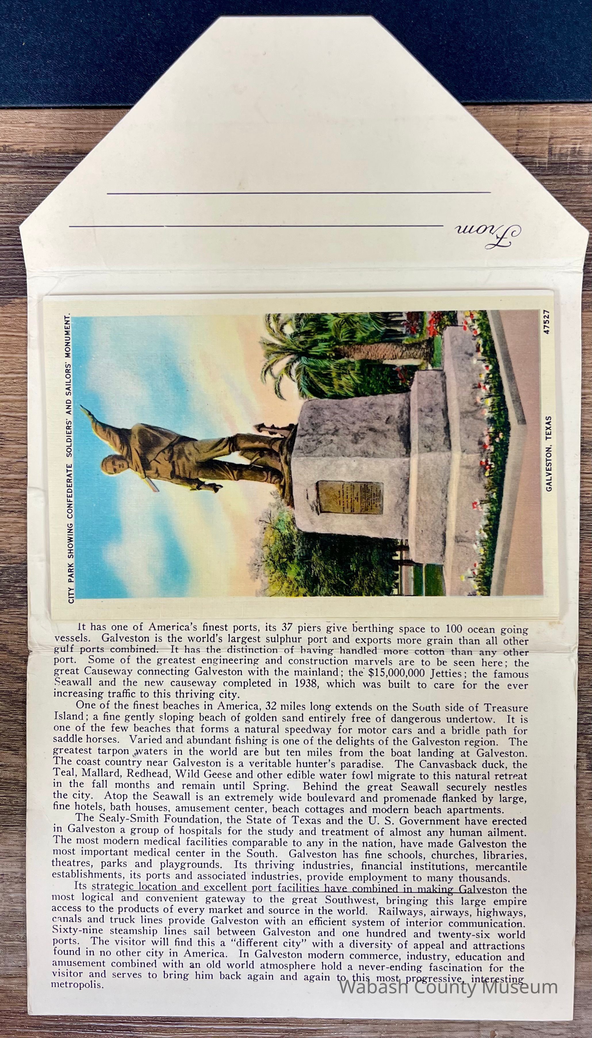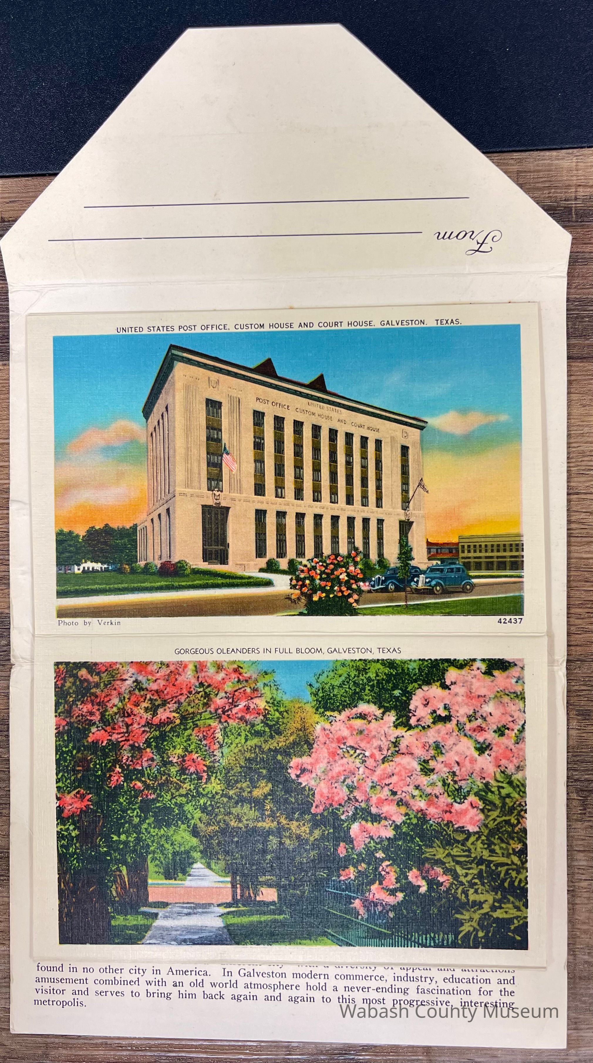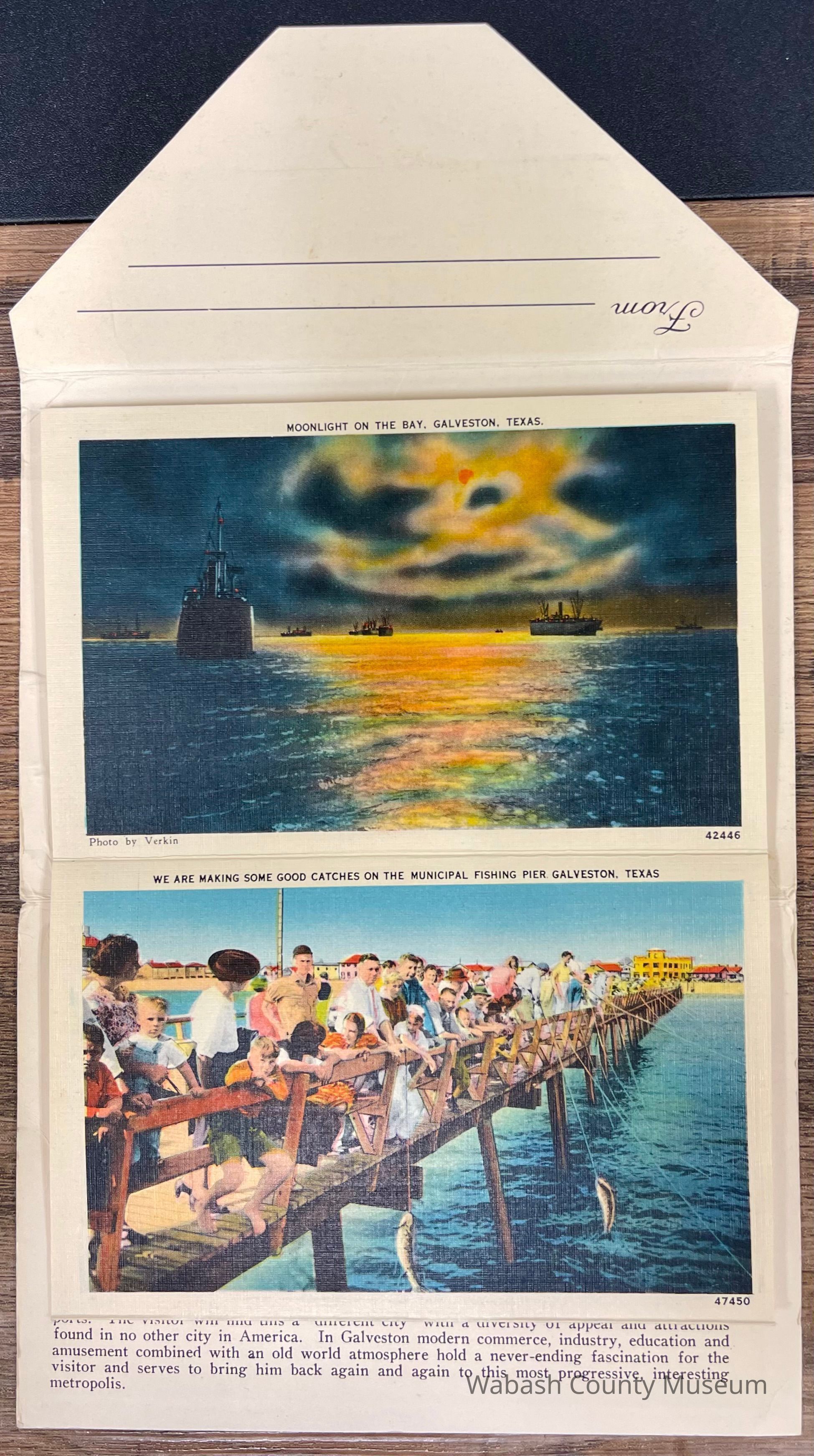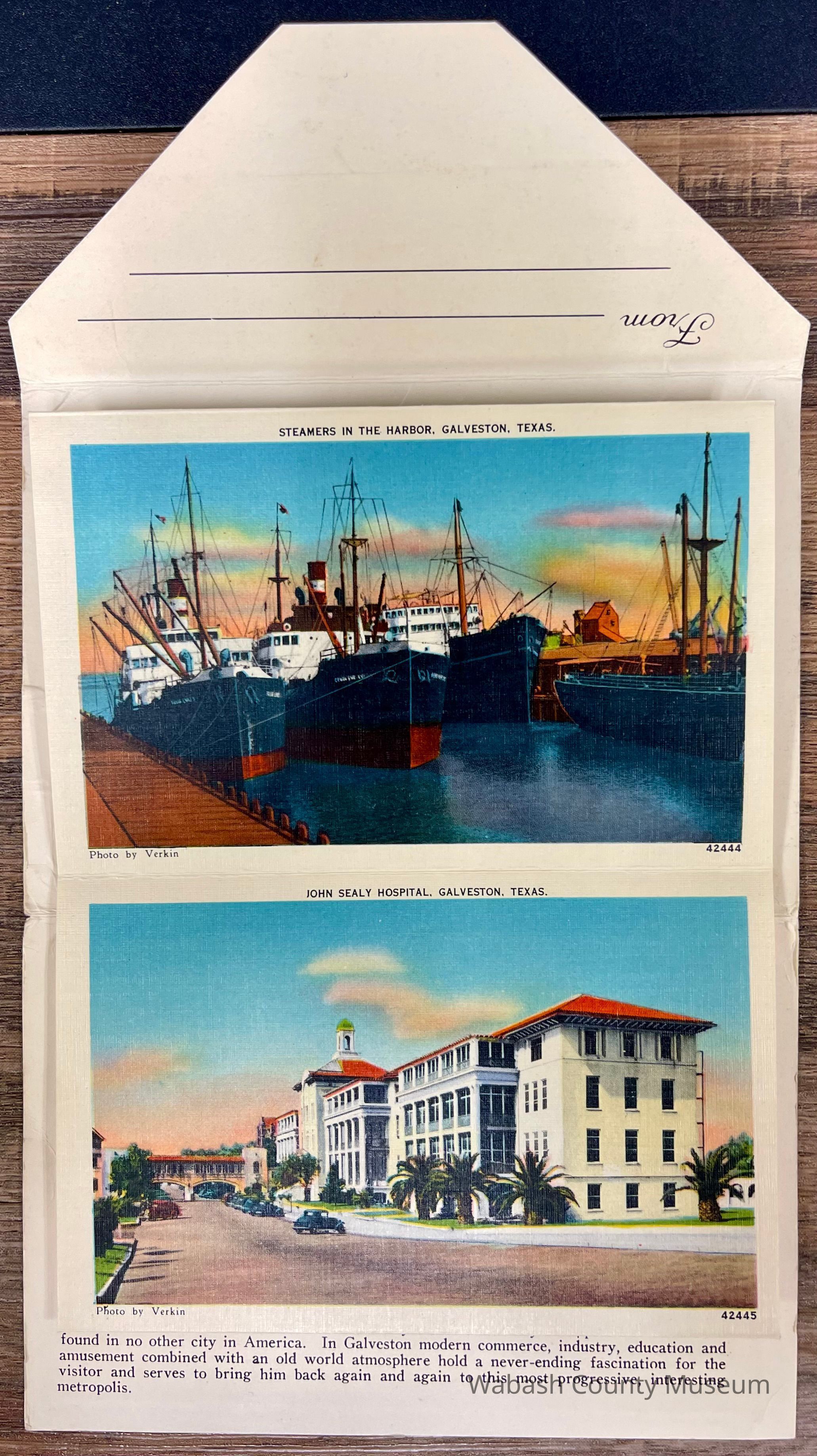 Set of Postcards "Greetings from Galveston Texas" to Arthur Haupert, postmarked Oct. 1, 1942. This is a set of ten postcards with different photographs front and back highlighting places in Galveston Texas. In addition to the postcards, on their cover, in the inside, is a description of Galveston "The Treasure Island of America" On the front of the set is a picture titled "New Causeway by Moonlight" and on the back is the "Marine Park and Million Dollar Pleasure Pier". Places represented on the postcards are: Beach Front and Seawall, Galveston Texas A Summer Day on the Beach, Galveston Texas United States Post Office, Custom House and Court House, Galveston Texas Gorgeous Oleanders in Full Bloom, Galveston Texas Steamers in the Harbor, Galveston Texas John Sealy Hospital, Galveston Texas Moonlight on the Bay, Galveston Texas We Are Making Some Good Catches on the Municipal Pier, Galveston Texas Hotel Galvez, Overlooking the Great Seawall and Gulf of Mexico, Galveston Texas Beautiful Broadway Boulevard Showing General Sidney Sherman Monument, Galveston Texas New Causeway by the Moonlight, Galveston Texas Union Station, Galveston Texas Texas Heroes Monument on Broadway Boulevard, Galveston Texas The Beach by Moonlight, Galveston Texas Fisherman's Luck is Good at Galveston, Galveston Texas Buccaneer Hotel and Seawall Boulevard, Galveston Texas Loading Sulphur at Docks, Galveston Texas Marine Park and Million Dollar Pleasure Pier, Galveston Texas St. Mary's Cathedral, Galveston Texas City Park Confederate Soldiers and Sailors Monument