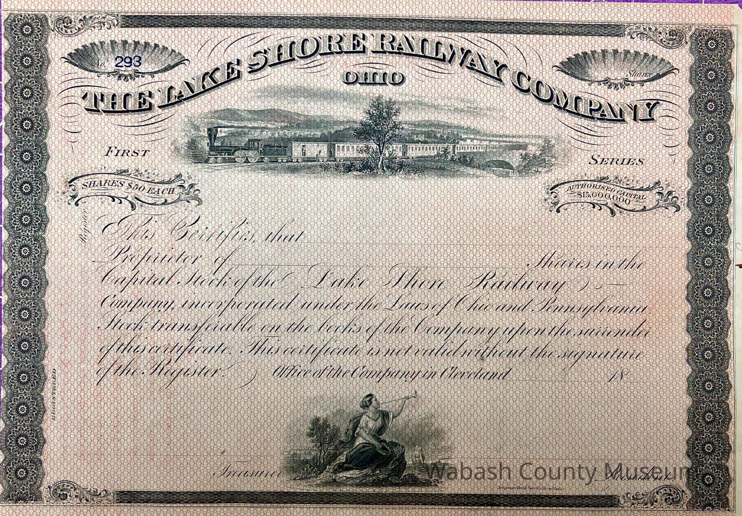 The Lake Shore Railway Company - Stock Certificate printed in faded red ink on the front and red ink on the back. Across the top of the certificate is The Lake Shore Railway Company, Ohio. Underneath that is a top vignette of a steam train with a long line of passenger cars. The bottom vignette has a classical female figure seated on a rock with a trumpet and ships in the background. Unissued and not signed. Certificate number 293 in the top left vignette shell. In the right shell is nothing (where number of shares goes).
