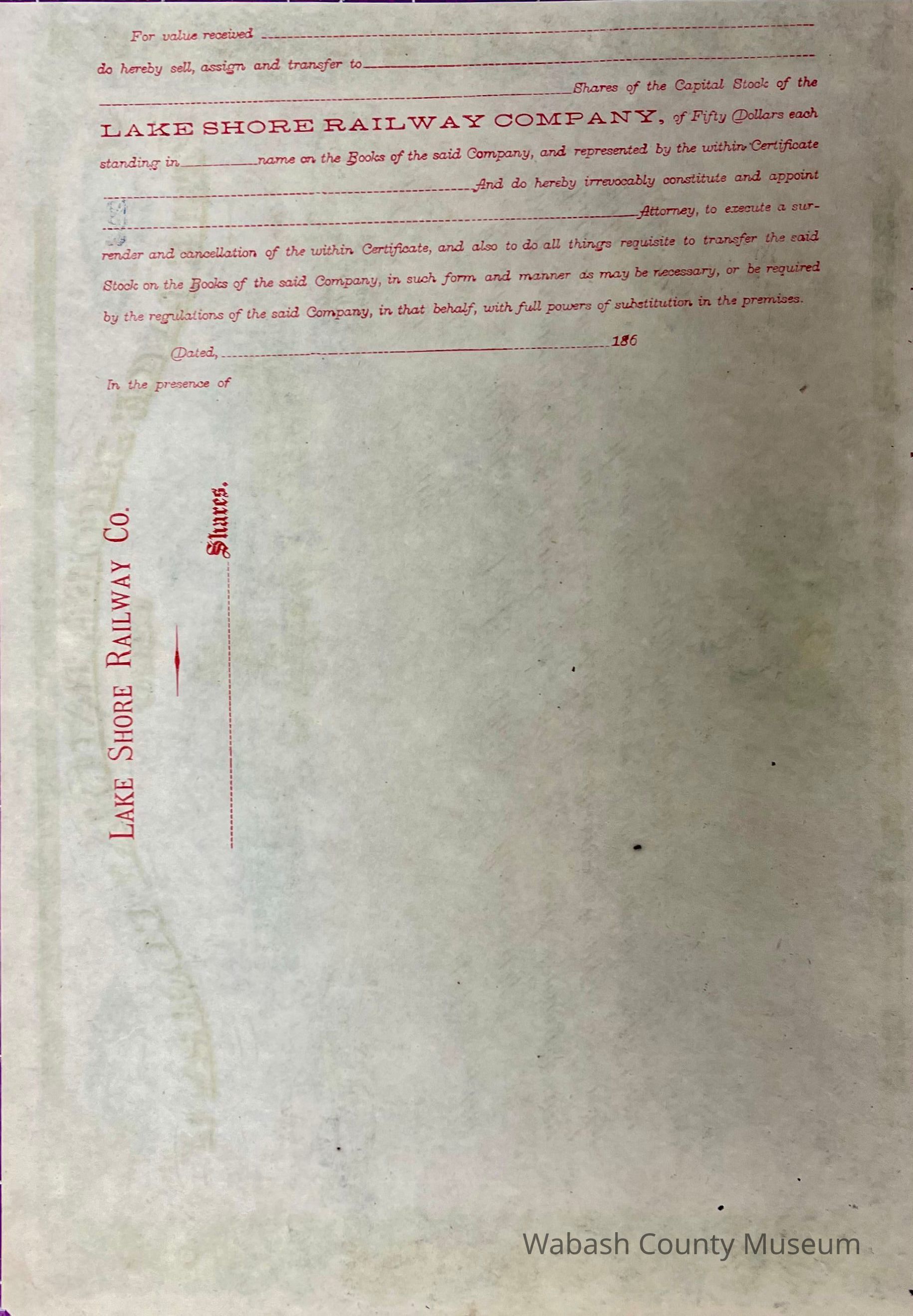 The Lake Shore Railway Company - Stock Certificate