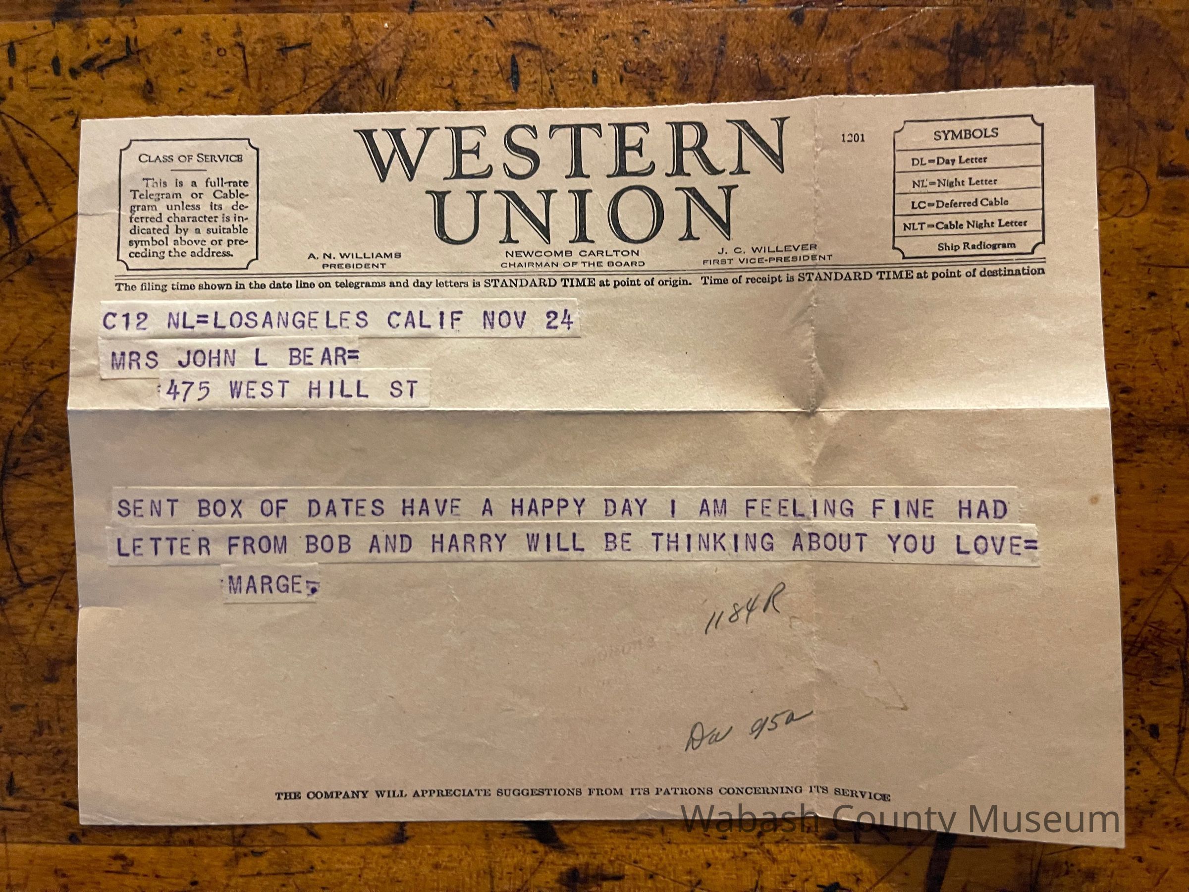 Western Union Telegram - Marge (Los Angeles, Calif.) to Mrs. John L. Bear (475 West Hill Street) Nov. 24