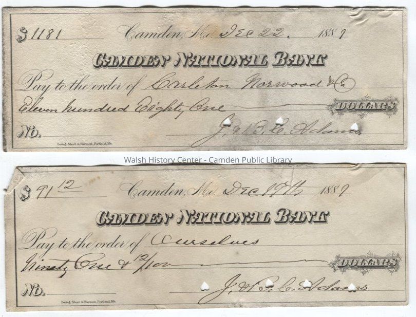 Two checks from Camden National Bank signed by J. B.C. Adams: