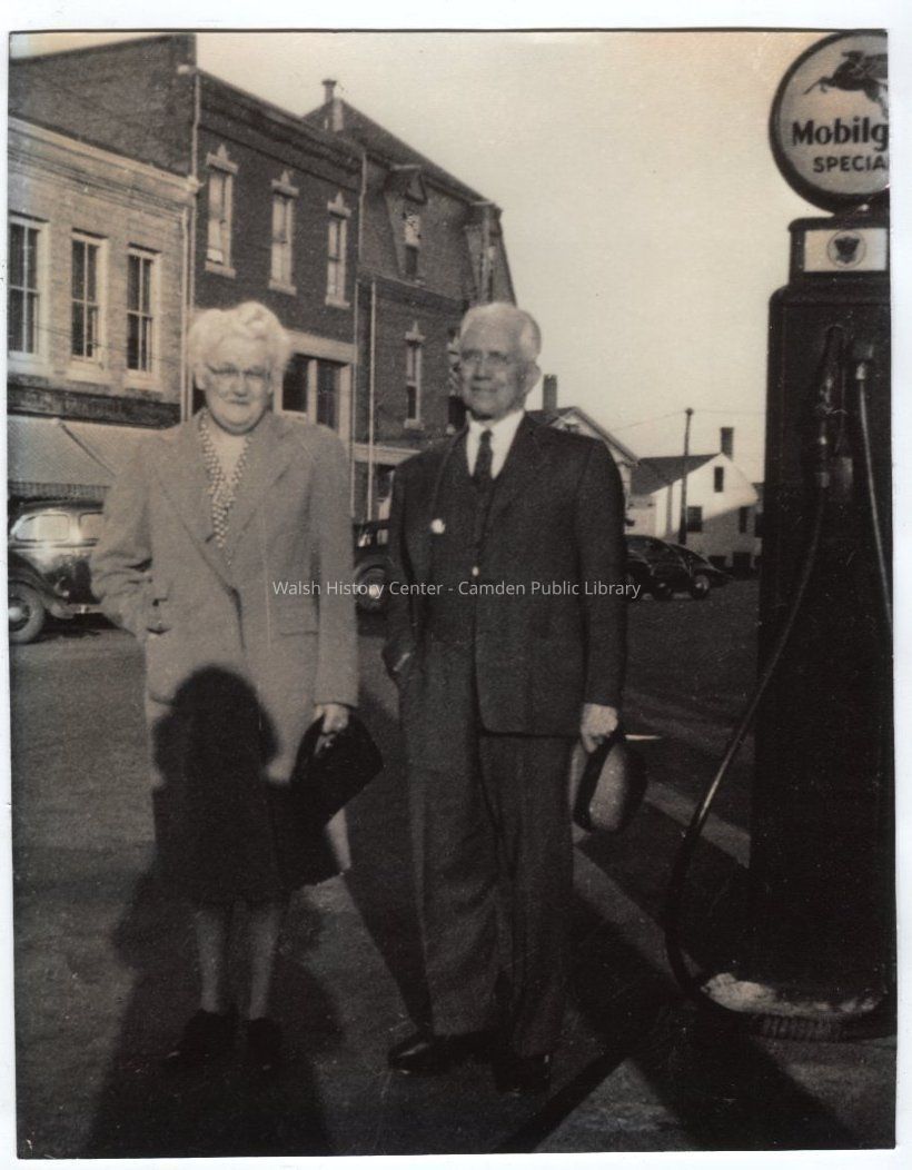 Photo of Edward Walsh and his wife standing on Mechanic Street in Camden. Mr. Walsh owned the Castro-Walsh children's clothing factory which was located in Camden for a brief time until it moved to Belfast, Maine.Collection