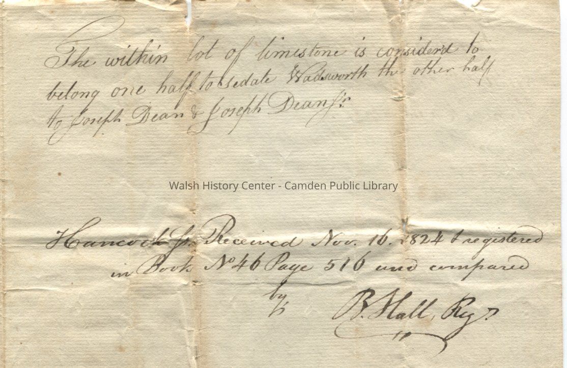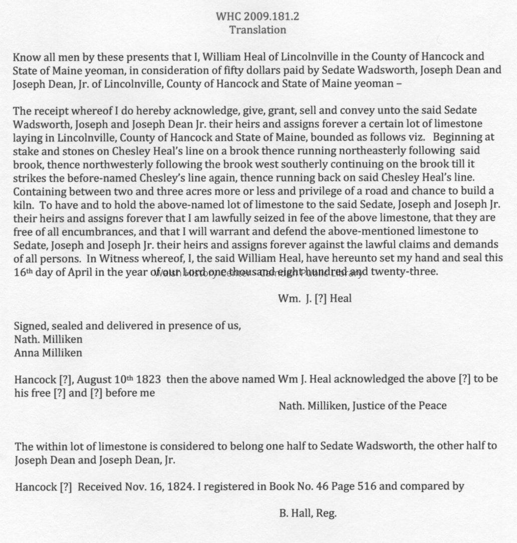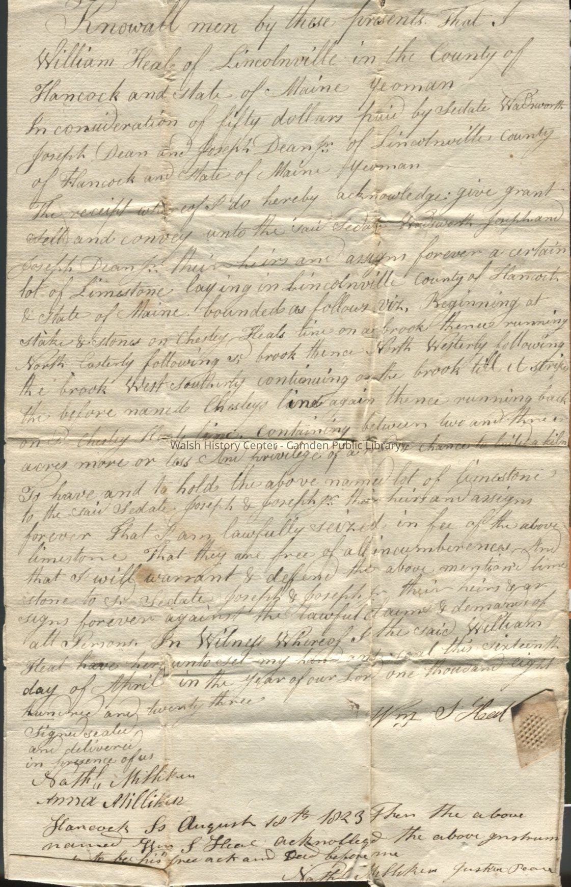 Deed for a limestone lot sold by William Heal of Lincolnville to Sedate Wadsworth, Joseph Dean and Joseph Dean, Jr. of Lincolnville, Hancock County, Maine. Deed is dated 16 April 1823, and signed on 10 August 1823 by Nathaniel Milliken, Justice of the Peace. Deed is registered in Hancock County, Book #46, Page 516 by B. Hall, Registrar.Collection