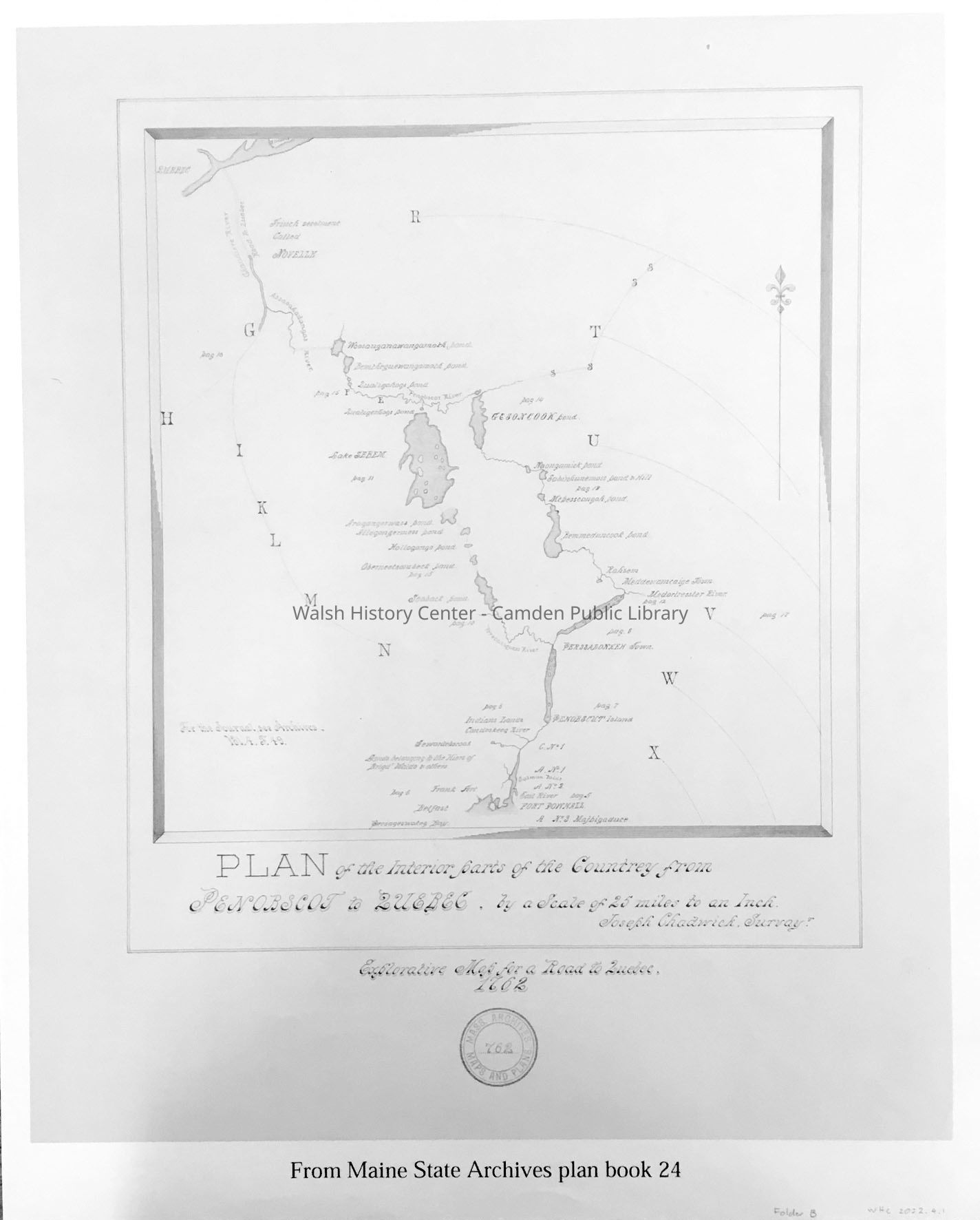 "A Draught of a Rout from Fort Pownall on Penobscot River by way of Piscataquess River, Lake Sabim, Wolf River, and the River Chaudiere, to Quebec and back again to Fort Pownall, by Penobscot River. Taken by order of His Excellent Francis Bernard, Esq; Governor &c of His Majesty's Province of the Massachusetts Bay in New England 1764."Collection