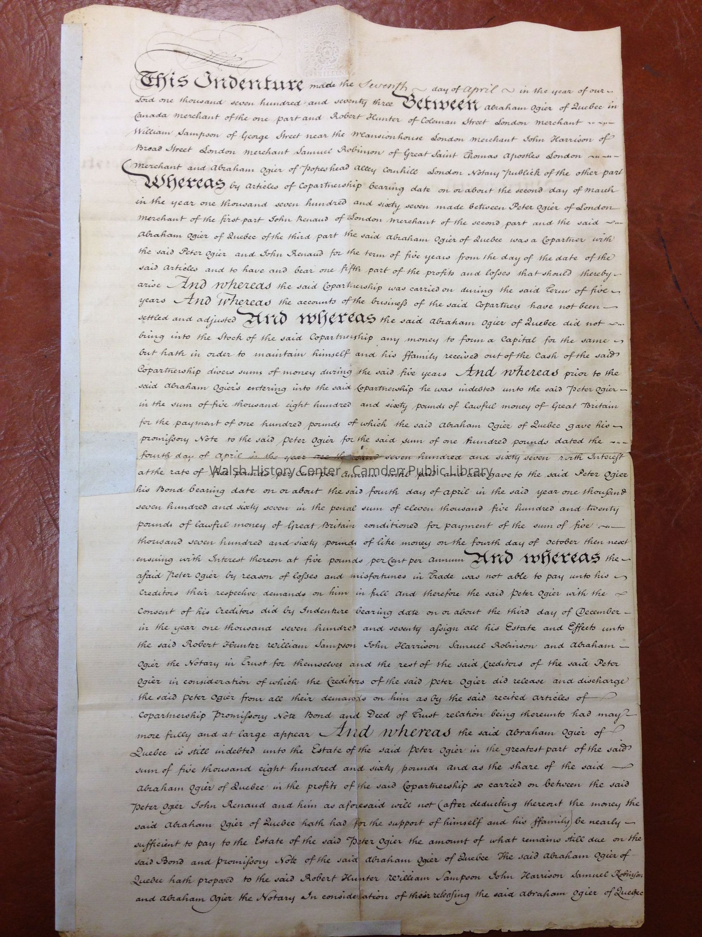 1773 Indenture on wove paper of 3 pages dated April 7, 1773, formally dissolving Abraham Ogier of Quebec from his partnership with a London based corporation seeking to profit from the establishment of a company in Quebec that Ogier oversaw.