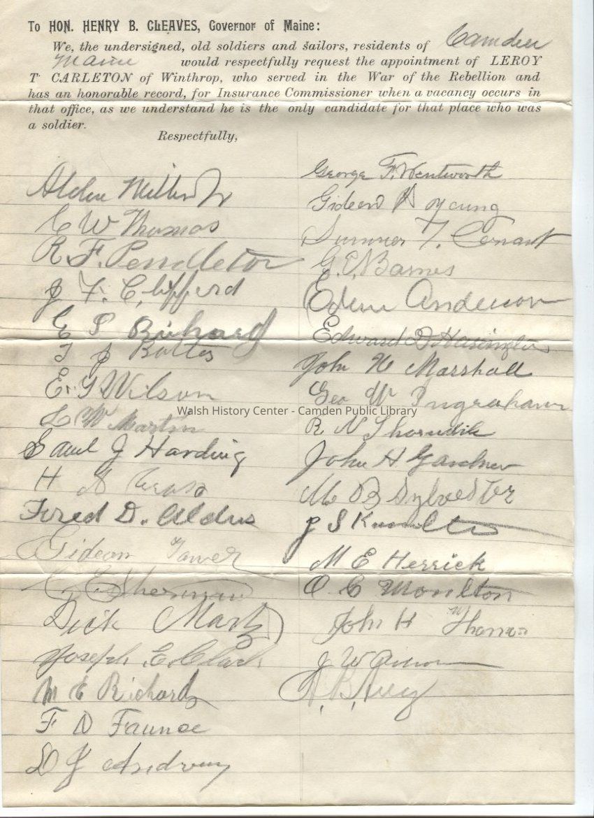 1893 Petition by the GAR Post at Camden, Maine to the Honorable Henry B. Cleaves, Governor of Maine, requesting the appointment of Leroy T. Carleton of Winthrop to the post of Insurance Commissioner. The Civil War veterans requested his appointment "as we understand he is the only candidate for that place who was a soldier." The petition is signed in pencil by 35 Union veterans residing in Camden.Collection