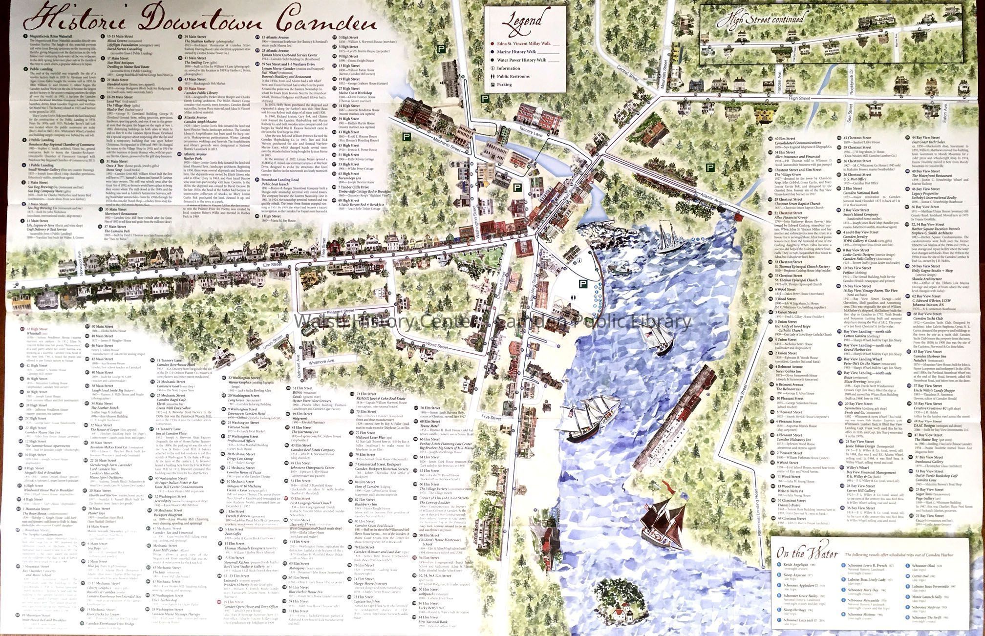 A color map depicting (in commendable detail) some 200 numbered structures along streets in the downtown area of Camden, with address and brief description of each, as well as 17 sailing vessels and motoer vessels offering scheduled trips out of Camden Harbor.