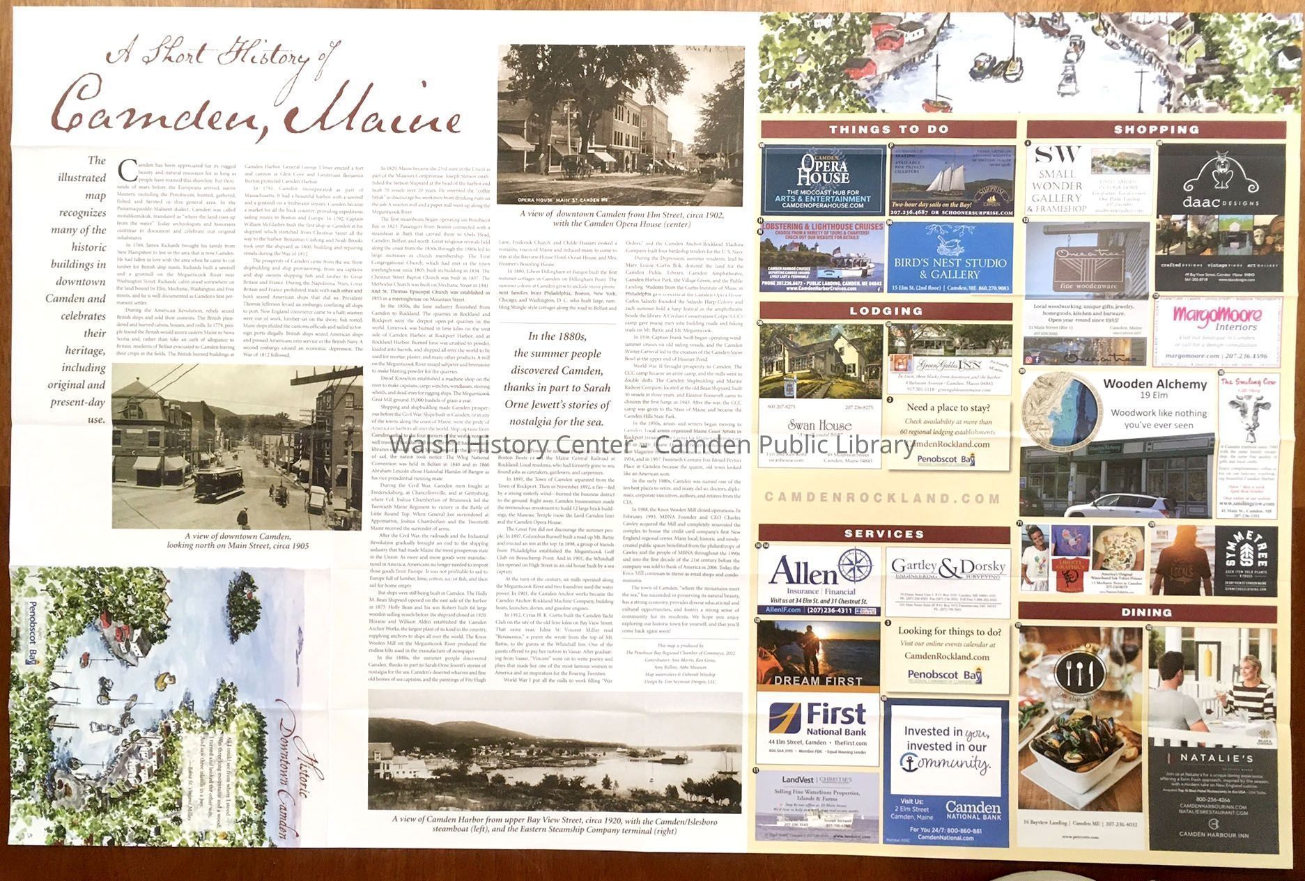 The reverse side includes "A Short History of Camden, Maine," a 1902 view of Camden from Elm Street, a 1905 view of Main Street, and a ca. 1920 panoramic view of Camden Harbor from upper Bayview Street, with ads from sponsoring businesses categorized as Services, Lodging, Shopping, Dining, and Things To Do.Collection
