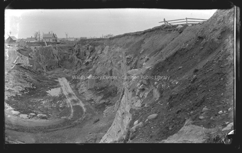 Black and white glass-plate negative image of the lime quarry in Rockport, Maine. Image likely taken circa 1887, prior to the 1907 which ended the lime industry in Rockport.Collection