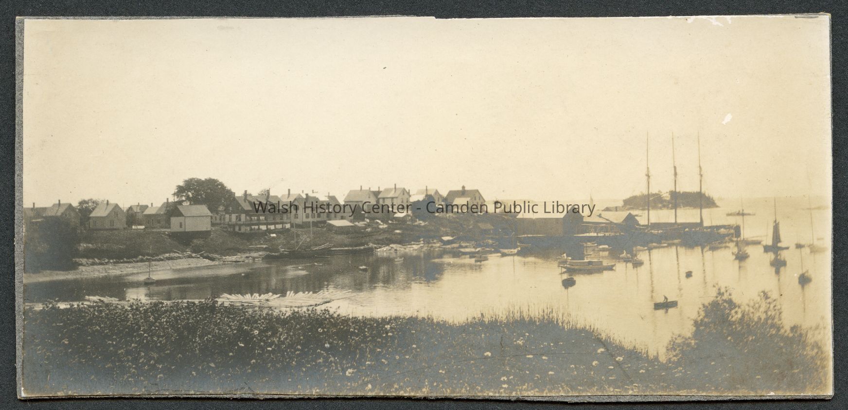 One 2 x 5" photograph of Camden harbor. Image was taken near Megunticook River waterfall. Visible are houses along Sea Street, Camden shipyard, and Negro Island (renamed Curtis Island in 1934).Collection