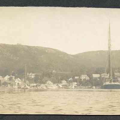 One 2 x 5" photograph of Camden harbor. View of inner Camden harbor with Bean shipyard on right and Mt. Battie and Mt. Megunticook in the background.Collection
