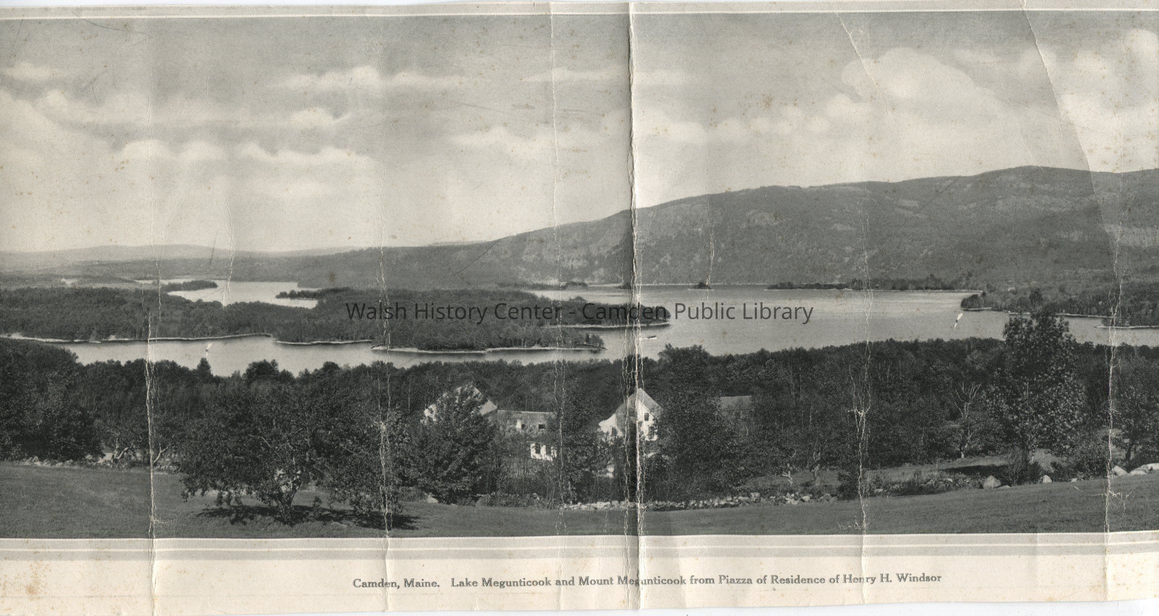 Panoramic letterpress print captioned "Camden, Maine. Lake Megunticook and Mount Megunticook from Piazza of Residence of Henry H. Windsor." The Windsor estate was later owned by the Rich family and known as "Richmont." It is now the home of singer Don McLean. Print is cut from the Glimpses of Camden series of tourist books by J.R. Prescott.Collection