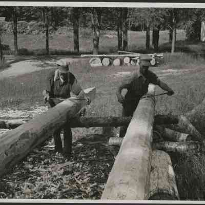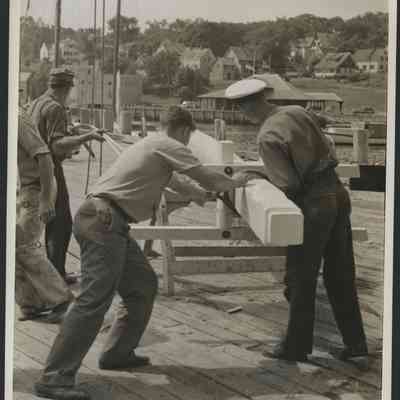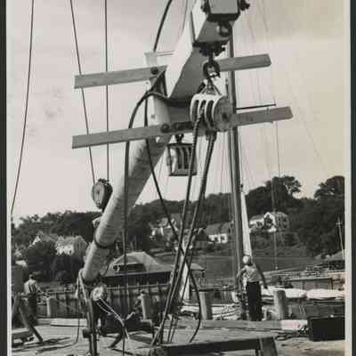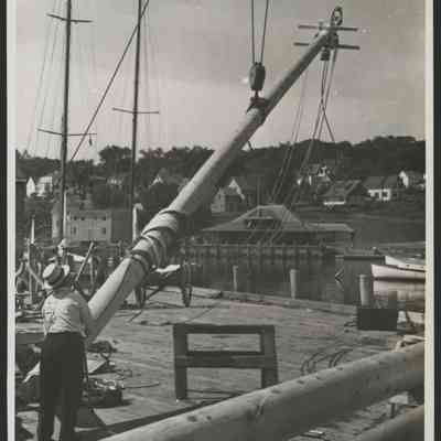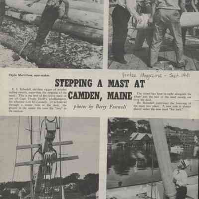 Thirteen photographs and one related article in Yankee Magazine (September 1941) about stepping a mast at the Camden shipyard in Camden, Maine. Article written by Betty Foxwell and features pictures of master sparmaker Clyde Merrithew and sailmaker E.J. Bohndell.Collection