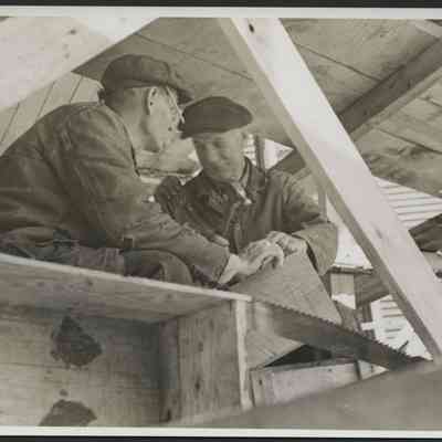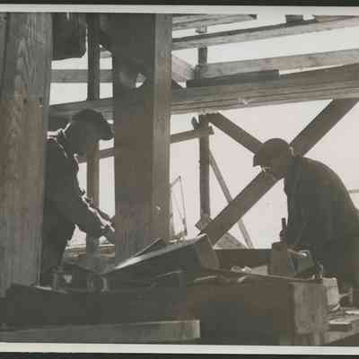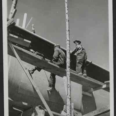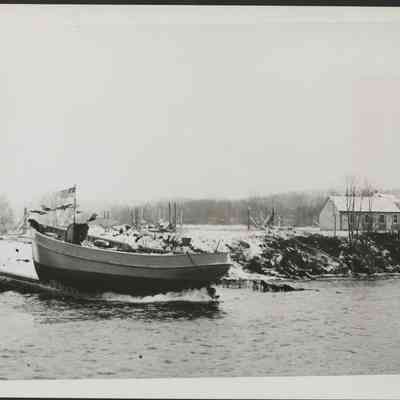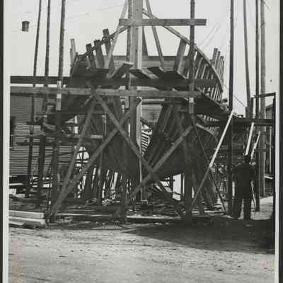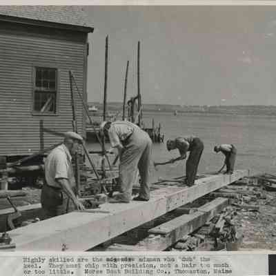 Collection of 16 photographs and two articles about shipbuilding at the Morse shipyard in Thomaston, Maine. The shipyard built fishing trawlers that were converted for use as minesweepers during World War II.Collection