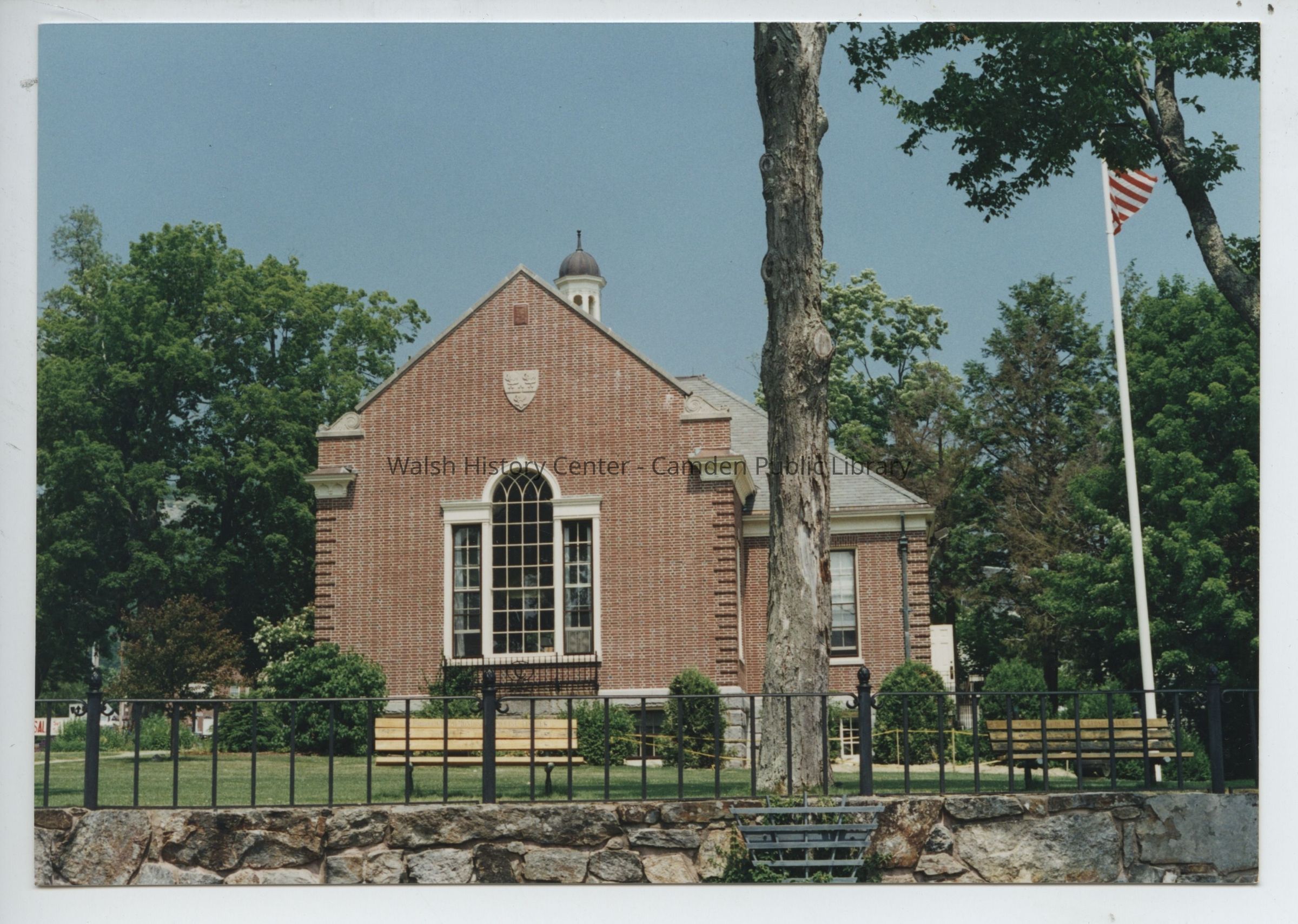 Photograph shows the south lawn of the Camden Public Library prior to the construction of the Centennial Wing c.1994/1995.Collection