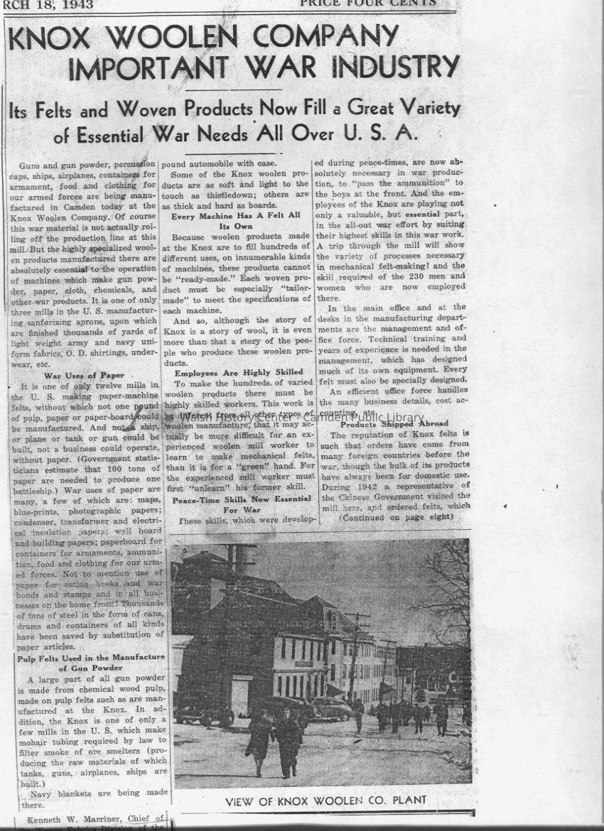 Clipping from the 18 March 1943 Camden Herald newspaper with the headline, "Knox Woolen Company Important War Industry." The article is of particular interest because it details the manufacturing process and function of each section of the mill, such as the Card Room, Fulling Room, Burling Room etc.Collection