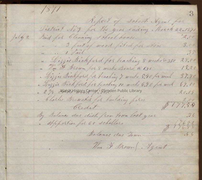 Record book started by school district 9 agent William F. Brown. The book contains 284 pages, of which 76 are used. There are many loose pages of notes inside the front cover. These have been removed and are cataloged separately. It is a record of notifications of meetings to legal voters in the town of Camden. It is also a record of expenses relating to upkeep of the schoolhouse and payment of teachers. G.W. Annis and John A. Rines are also listed as agents for the district. The book concludes with the 1898 report of J.B. Simonton, agent for School District No. 4 in Rockport, Maine.Collection