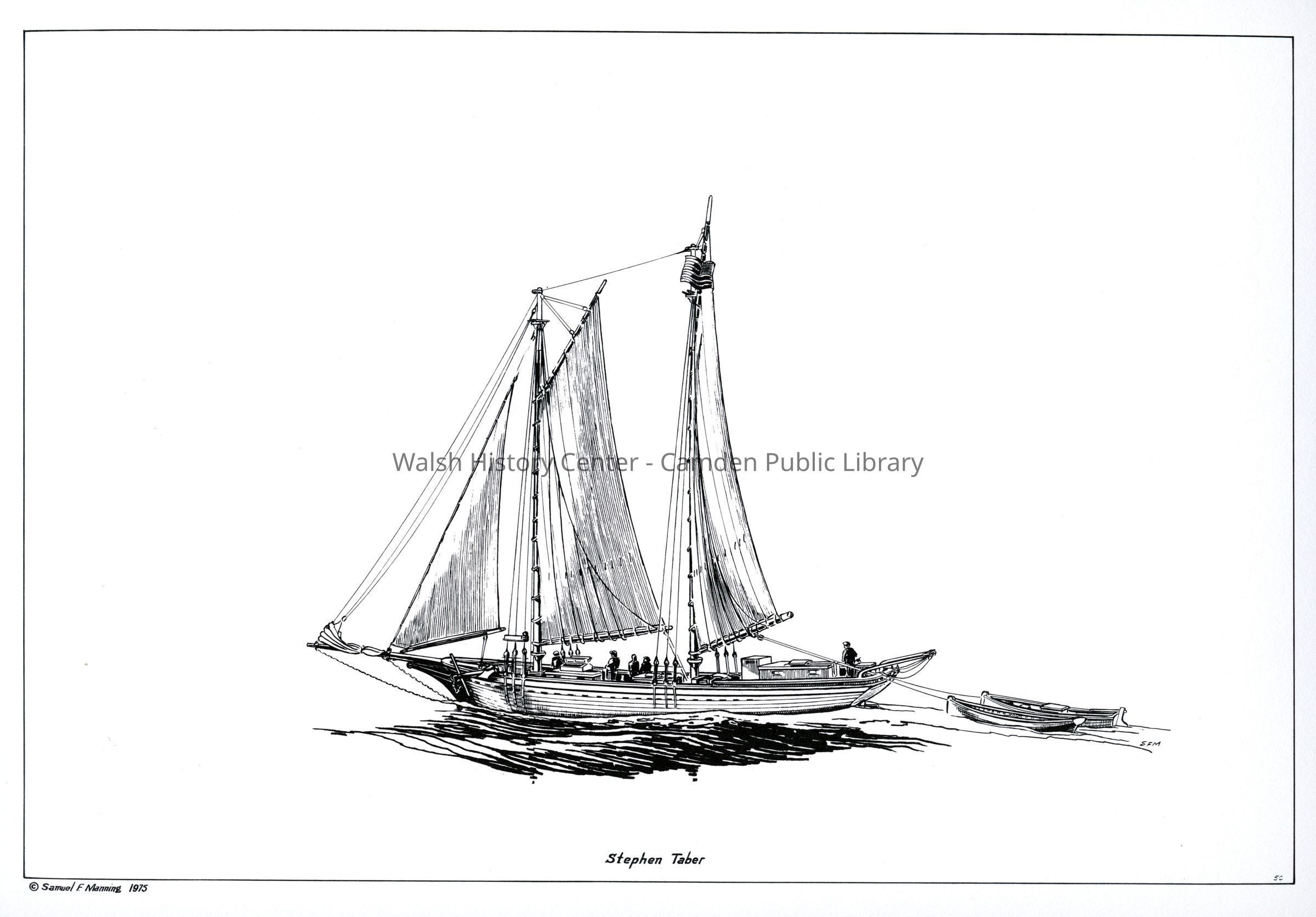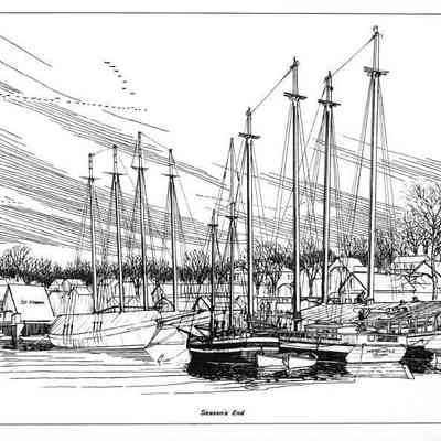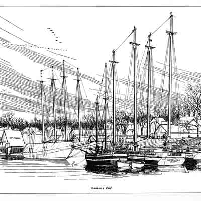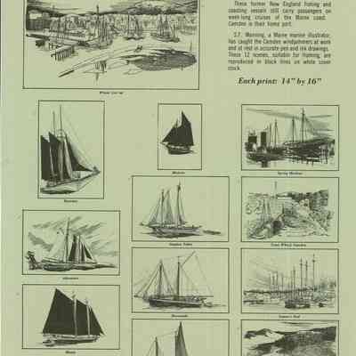 Complete set of 12 pen and ink drawings of the working schooners of the Maine coast by marine illustrator Samuel F. Manning titled "Home port, Camden, Maine." Each print is 14x16" on white cover stock.Collection