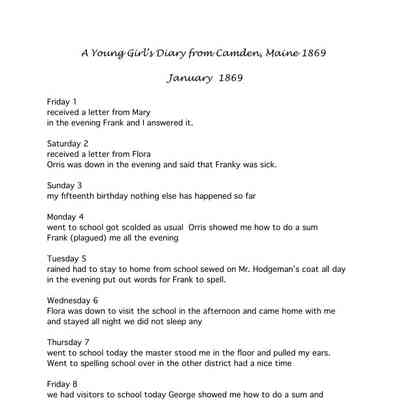 Small brown cloth diary (2 1/2 x 4") written throughout 1869 by an anonymous 15-year-old girl who lived in the Camden area.Collection