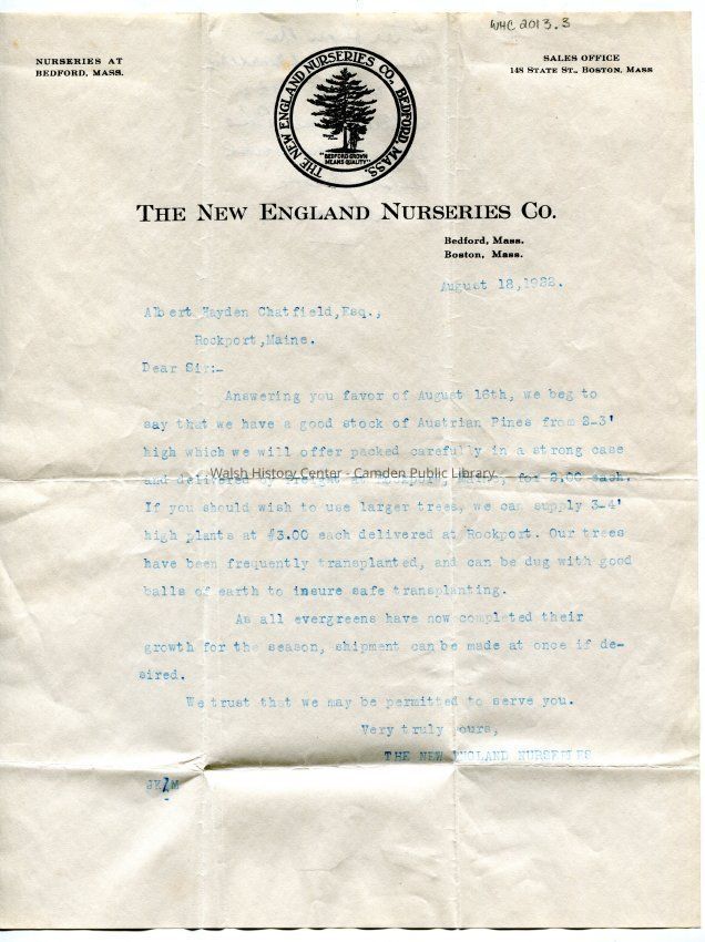 Letter to Albert H. Chatfield from New England Nurseries Company of Massachusetts regarding cost of pine trees for Victory Grove memorial at Aldermere Farm. Letter dated August 18, 1922.Collection