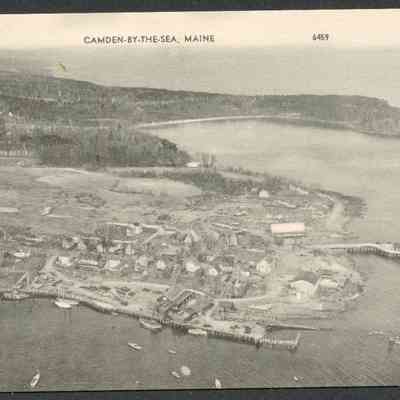 Aerial postcard view of the Camden shipyard and Sherman's Point. Card produced by the American Art Postcard Company of Boston and titled "Camden-By-The-Sea, Maine."Collection