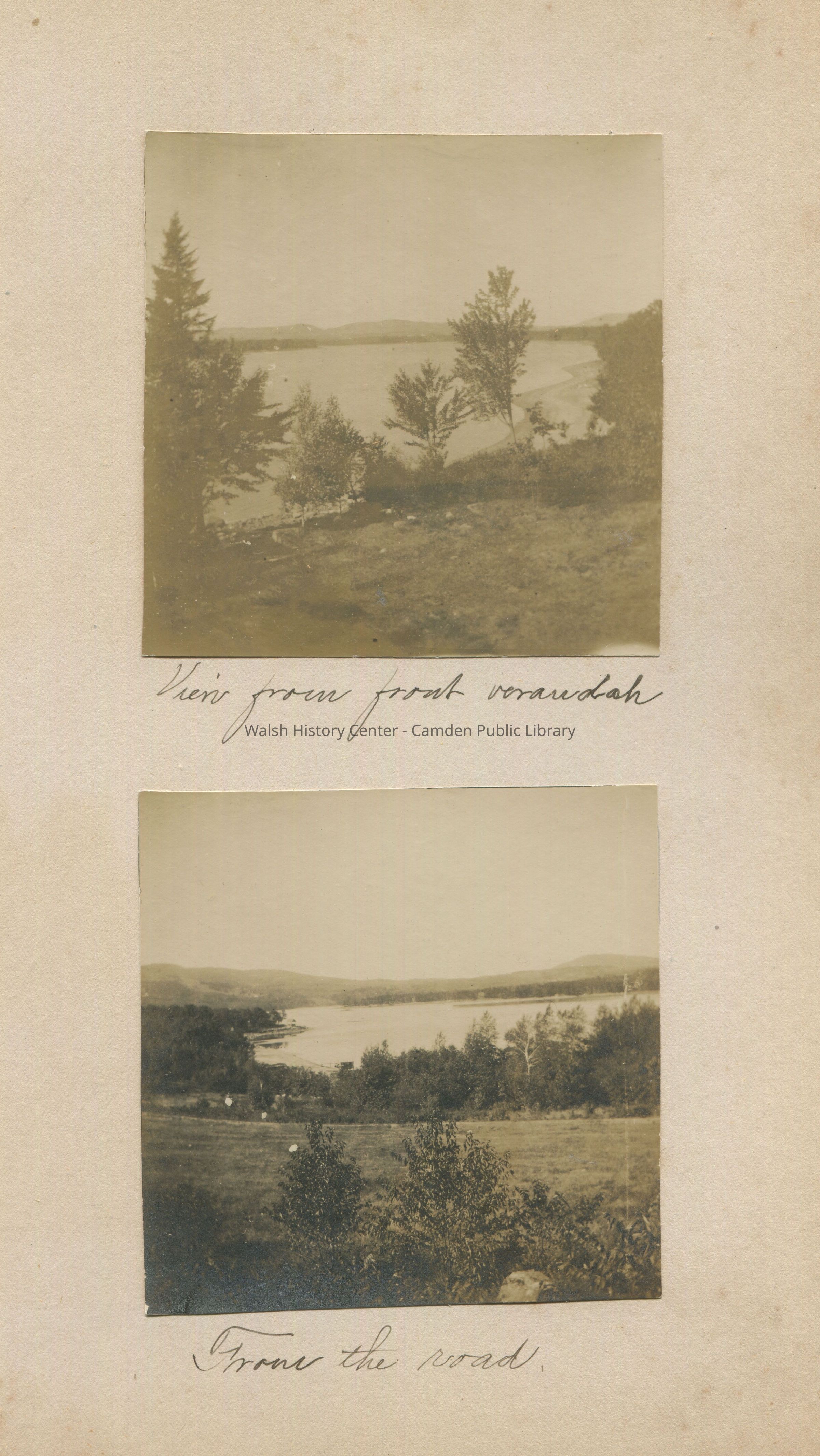 View of Lake Megunticook from front verandah of Gookin cottage possibly; View of Lake Megunticook from road of Gookin cottage possibly;