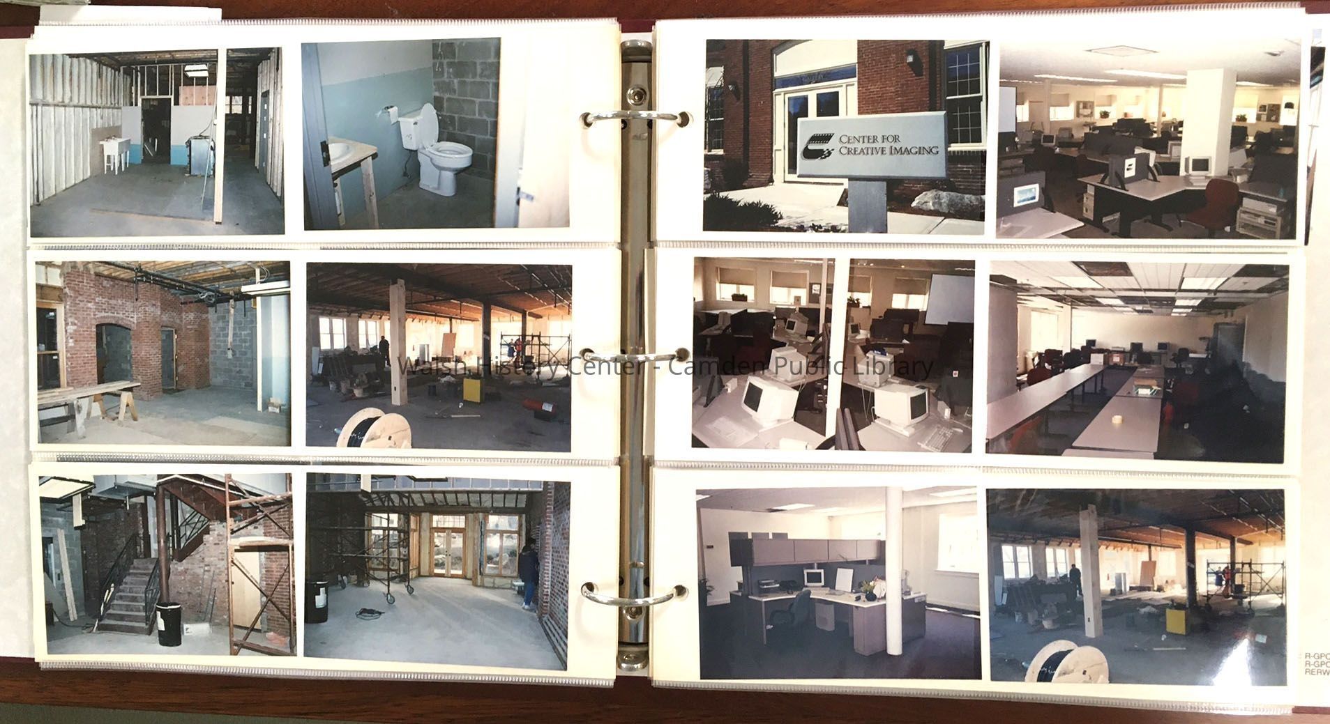 Photo album of CCI (Center for Creative Imaging / Kodak Center). Approximately 372 photos; no identifying labels. Consruction photos, including dam work and a few "before" photos showing the site before construction. Several photos of workers and CCI officials, and Sonny Goodwin and Stormy Bok.It was formerly the Knowlton Brothers Manufacturing site. Now Bella Point.Collection