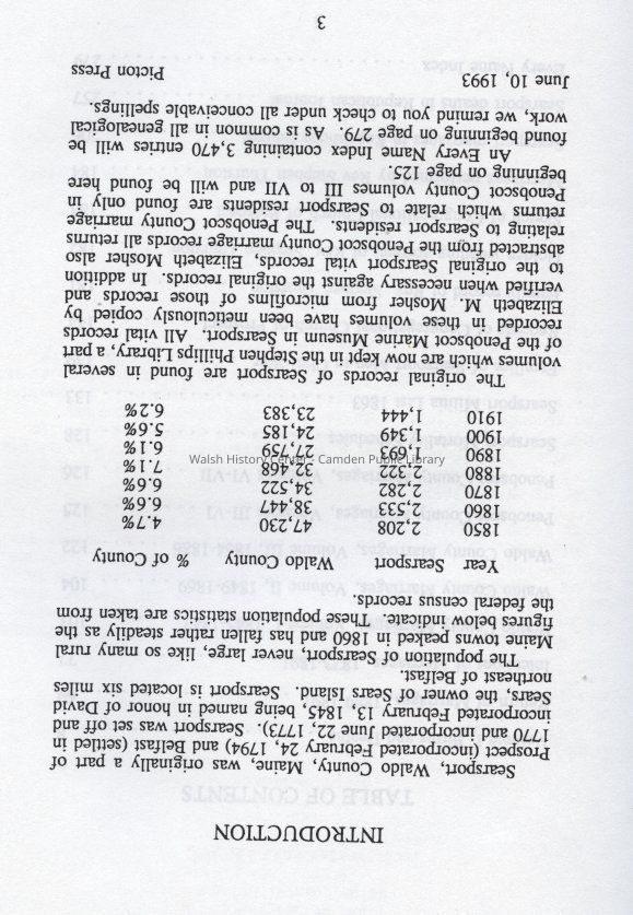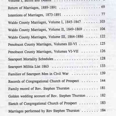 A compilation of the records of the births, marriages and deaths in Searsport prior to 1892, copied from microfilms of those records and verified when necessary against original records. Penobscot County marriage records were also abstracted that related to Searsport residents. Records were also copied from the Republican Journal, from church records and from the militia list of 1863.