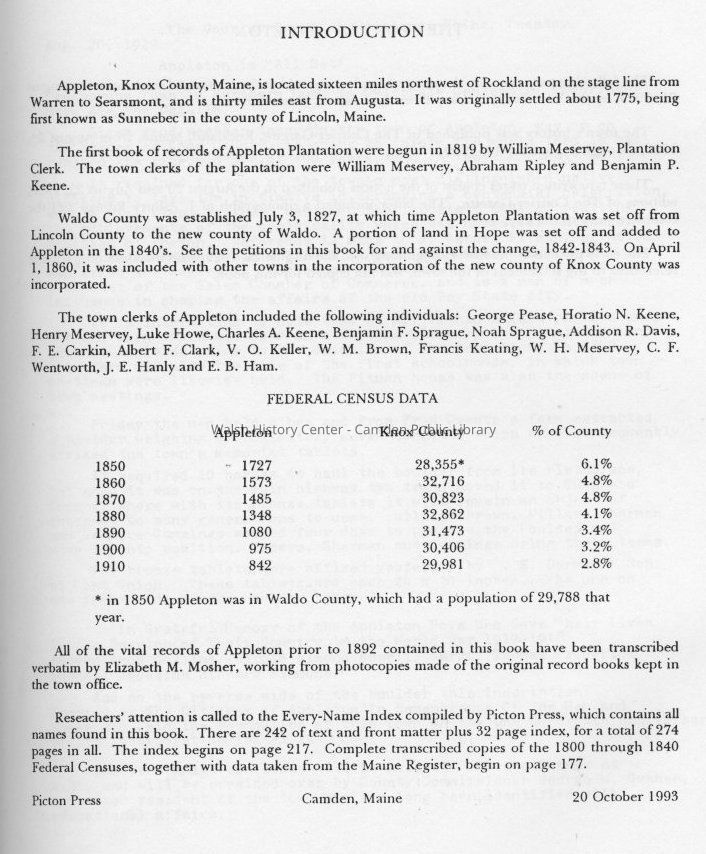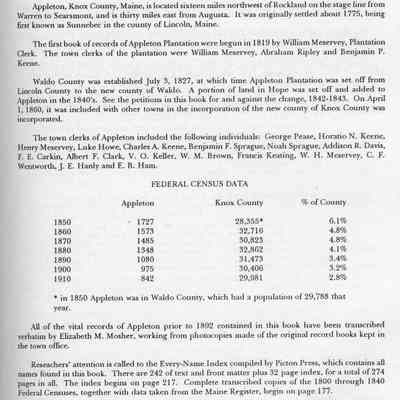 A transcription of the vital records of Appleton in Knox County, Maine working from photocopies of the original record books kept in the town office. Also included is Federal Census data for 1850 through 1910 and a history of the town written by J. Asbury Pitman and published in the Courier Gazette as part of the town's centennial celebration on August 21, 1929. Excerpts from the Maine Register 1873-1885 are included.