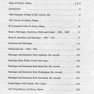 A one volume compilation of the vital records of Liberty Maine as transcribed by Isabel Morse Maresh. Also included are militia records, census data, a few maps and pictures as well as a copy of the 1927 Brief History of Liberty.