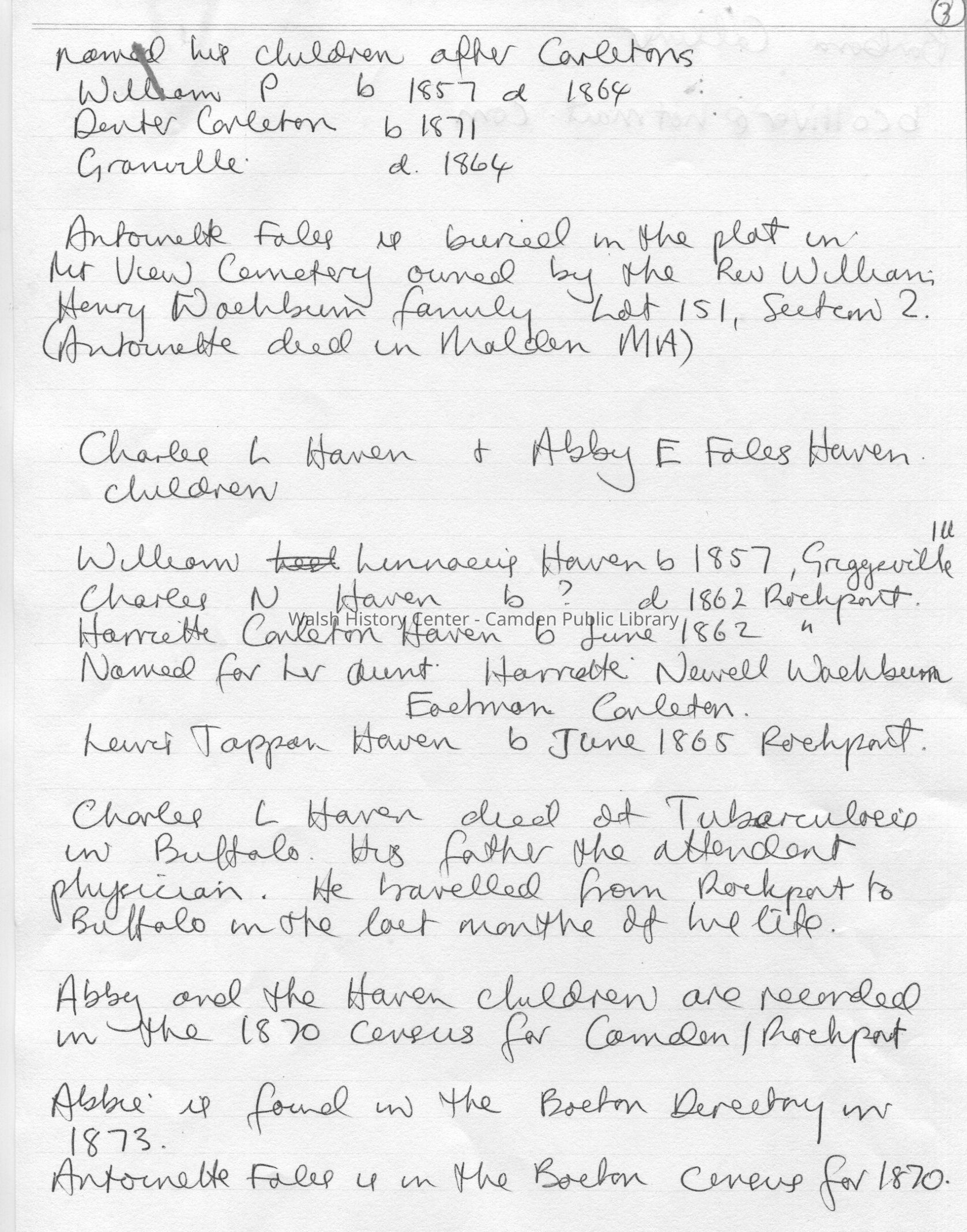 Photocopies of documents relating to the Carleton, Haven, Fales, and Washburn families of Rockport and Camden. These were compiled by a visiting researcher who gave copies for the collection. Includes Civil War pension application by Dr. Charles L. Haven's widow Abbie E. (Fales) Haven, the Civil War enlistment papers of Dr. Charles Haven in the Veteran Reserve Corps, Reg. 24, Co. B, and the researcher's handwritten genealogy of the families.Collection