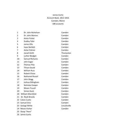 Account book of shopkeeper James Curtis (1781- of Camden, Maine 1812-1816. It records transactions of approximately 180 early settlers of Camden and Hope. James Curtis may have been the brother of Captain Calvin Curtis (1777-1828), town clerk of Camden in 1811 and customs collector.Collection