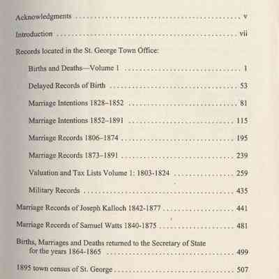 A one volume compilation of the vital records of St. George, Maine transcribed from the town's microfilms and a few photocopies of those that had not been microfilmed. Alo included are the marriage records of two Justices of the Peace, Samuel Watts and Joseph Kalloch.