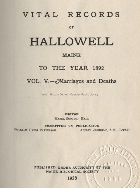 Vital Records of Hallowell Maine to the Year 1892. Volume 5 - Marriages and Deaths.Entry/Object ID