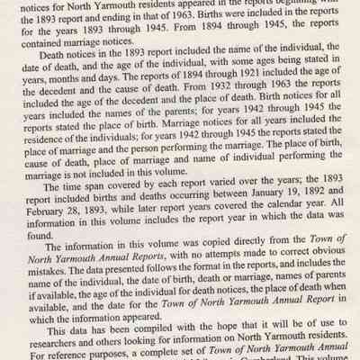 A one volume compilation of the vital records of North Yarmouth, Maine as taken from the Town Reports from 1893 to 1963. The entries are arranged alphabetically by surname. Marriage records include the surname of the bride as well as that of the groom. The records are copied directly from the town reports for that time period.