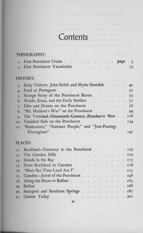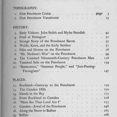 A history and a geographic description of the land bordering Penobscot Bay and the Penobscot River area. It includes the islands of Penobscot Bay as well. The work is illustrated by woodcuts done by Carroll Thayer Berry.