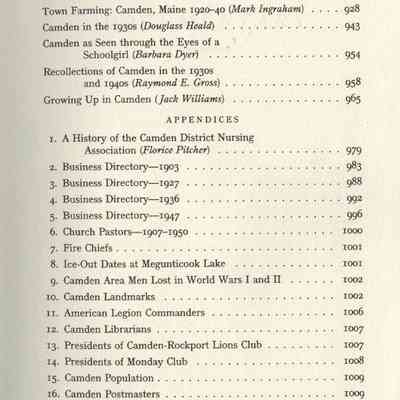 Using Reuel Robinson's History of Camden and Rockport that ended in 1907, Williams has written this volume to cover the period 1931-1950 and uses nearly the same format as that of Robinson. The Camden Herald records are the primary source for information. Besides news events etc, Williams includes officers of town organizations, weather reports, town vital statistics etc.. In the center of the book is a section containing representative photographs of this time period. At the end of the book is a series of narratives written by local people. In the appendices are lists of town officials and town organizations, church pastors and ice-out dates on Megunticook Lake.