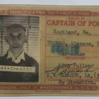 Identification card issued by the Coast Guard Captain of the Port of Rockland, Maine, to Alanson B. Thomas. The card lists his occupation as carpenter and includes a photograph and a fingerprint. Thomas's sponsor was Edna Fuller, and Lt. S.K. Gamache signed the validation line.Collection