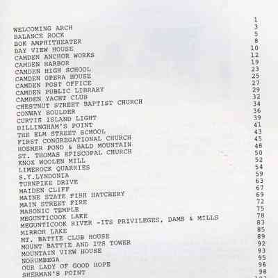 A book of postcards of Camden with a brief historical sketch about each topic. A table of contents lists the areas and buildings covered.