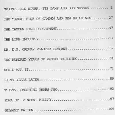 History of the Camden area by local historian. Includes articles on Megunticook River, dams, 1892 fire, Camden Fire Department, lime industry, Ordway Plaster Company, shipbuilding, World War II, Edna St. Vincent Millay, and Gilbert Patten.