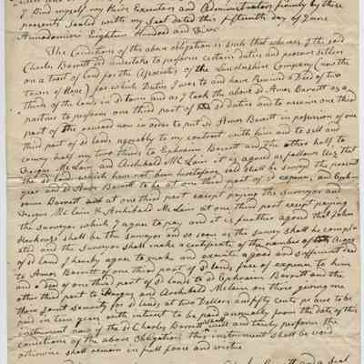 The Conditions of the above obligation is such that whereas I the said Charles Barrett did undertake to perform certain duties and procure settlers on a tract of land for the Associates of the Lincolnshire Company (now the Town of Hope) for which Duties I was to and have Received a deed of two thirds of the lands in sd town and as I took the above sd Amos Barrett as a partner to perform one third part of sd duties and to receive one third part of the reward now in order to put sd Amos Barrett in possession of one third part of sd lands agreeably to my contract with him and to sell and convey half my two thirds to Ephraim Barrett and the other half to Fergus McLain and Archibald McLain it is agreed as follows Viz. that the sd lands which have not heretofore been sold shall be surveyed the present year and sd Amos Barrett to be at one third part of sd expense, and Ephraim Barrett at one third part except paying the Surveyor and Fergus McLain & Archibald McLain at one third part except paying the Surveyor which I agree to pay and it is further agreed that John Harkness shall be the Surveyor and so as soon as the survey shall be completed and the Surveyor shall make a certificate of the number of Acres of sd land I hereby agree to make and execute a good and sufficient deed to Amos Barrett of one third part of sd lands, free of expense to him and a deed of one third part of sd lands to sd Ephraim Barrett and the other third part to Fergus and Archibald McLain on their giving me their joint security for sd lands at two Dollars and fifty cents pr acre to be paid in ten years with interest to be paid annually from the date of this instrument now if the sd Charles Barrett shall well and truly perform the conditions of the above Obligation this instrument shall be void otherwise shall remain in full force and virtue