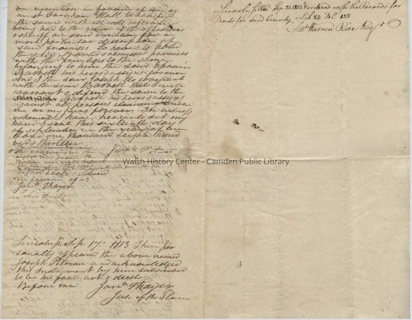 Lincoln ss Rec Sep 21, 1813 & entered with the Records for Deeds for said County, Lib 84 Fol 128