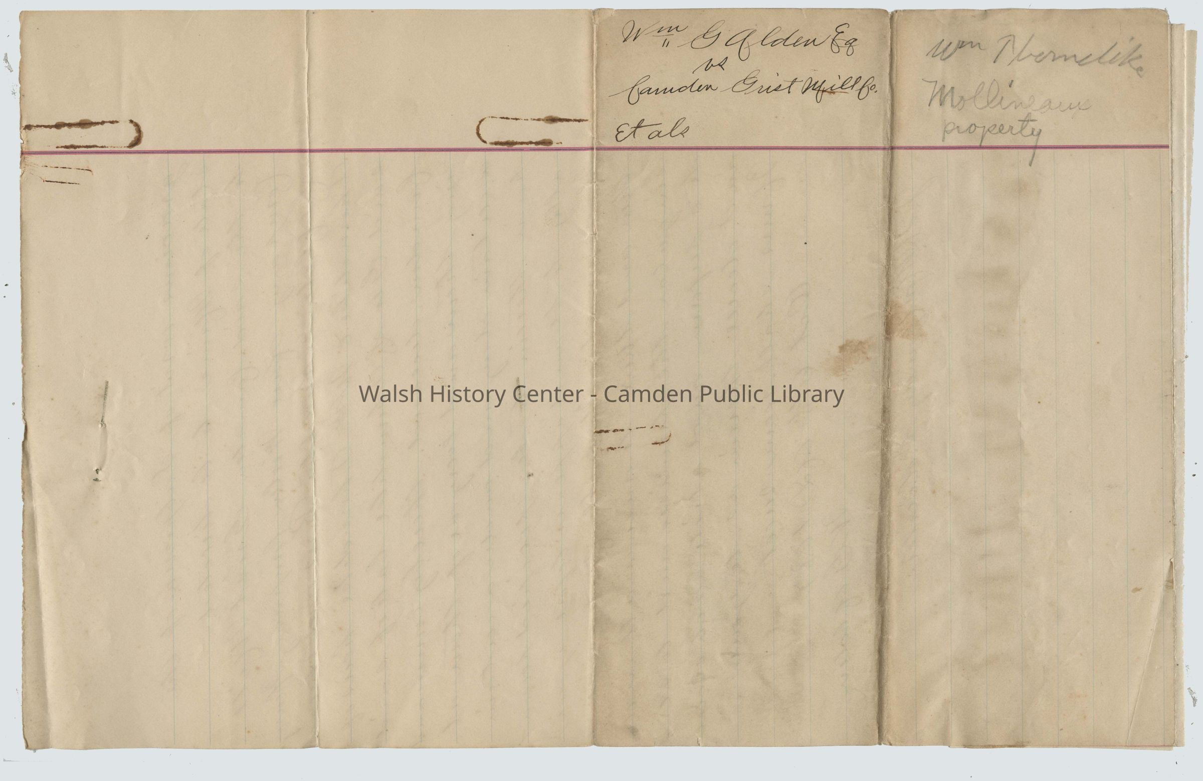 Notes: LAWSUIT AND ORDER TO APPEAR WILLIAM G. ALDEN VS. CAMDEN GRIST MILL ET. ALS, OCTOBER 6, 1887