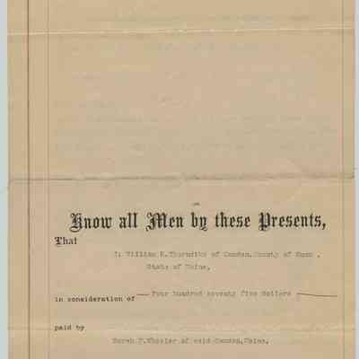 Know all Men by these Presents, That I; William E. Thorndike of Camden, County of Knox, State of Maine, in consideration of Four hundred seventy five dollars paid by Sarah P. Wheeler of said Camden, Maine, the receipt whereof I do hereby acknowledge, do hereby give, grant, bargain, sell and convey, unto the said Sarah P. Wheeler, her Heirs and Assigns forever, a certain lot or parcel of land situated in said Camden, westerly of Chestnut St. bounded and described as follows: - Beginning at an iron bolt in southerly line of land of T. R. Simonton at north west corner of land formerly of Mary J. Conant, now owned by R. L. Cross; thence S.17 ½ ° E. nine rods and three links to iron bolt to line of land formerly of W.G. Barrett, now owned by said Thorndike; thence S. 78° along line of said Thorndikes land twenty one rods and twenty links to line of land of the Baptist Church Society of said Camden; thence N. 5° E. along line of land of said Society and land of Kate and Ellen Hall eleven rods and fourteen links to iron bolt to line of land of J.F. Hosmer estate; thence N. 84° E along line of land of said estate and land of Marcia Benson, Marion Paine, E.H. Young and T.R. Simonton nineteen rods and seven links to the place of beginning. Also another lot or parcel of land situated in said Camden, bounded and described as follows:- Beginning at an iron bolt in southern line of Union Place (the street running westerly from Chestnut St along northern line of land of T.R. Simonton) fifteen feet and four inches westerly of the corner of the old Coburn Tyler house; thence S. 17 ½ ° E. forty two and one half feet to iron bolt; thence easterly along line of first described lot twenty three and one half feet to iron bolt; thence northerly along said Tylers line eight feet to corner of wood house; thence westerly two feet eleven inches to corner of porch; thence northerly by porch eighteen feet three inches to corner; thence westerly by house six feet four inches to corner; thence northerly as said house runs sixteen feet nine inches to line of said Union Place; thence westerly as said Place runs fifteen feet and four inches to place of beginning excepting a right of way two feet wide along the western side of Coburn Tyler house and porch as granted to said Marcia Benson by said Sarah P. Wheeler.