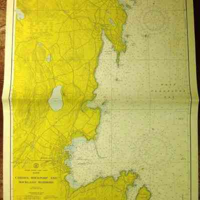 CAMDEN, ROCKPORT, AND ROCKLAND HARBORS. United States - East Coast -Maine. C&GS Chart No. 209. 5th Ed. , Sept. 1, 1973. Stamped "SOUNDINGS IN FEET." Soundings in feet at mean low water. Marine Navigation Chart from Owls Head (South) to Dillingham Ledge (North). Scales In Nautical Miles and in Yards. Folded in half. (N.O. 13/30)Collection