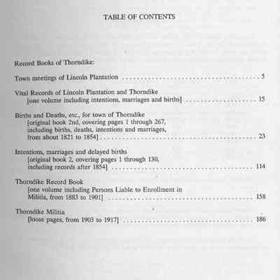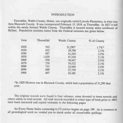 Vital records from approximately 1821 through 1891 for the town of Thorndike (Waldo County), Maine, which was originally called Lincoln Plantation (Hancock County). Includes an every name index with 6,172 entries.