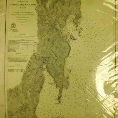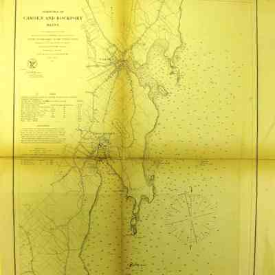 HARBORS OF CAMDEN AND ROCKPORT, MAINE. [1864/1865] from a Trigonometric Survey Under A. D. Bache, Superintendant of the Survey of the Coast of the United States. Scale 3 1/8 " to 1 Mile. Soundings are shown for the marine waters; individual buildings, roads, paths, streams, and land cover are depicted on the land area shown. Triangulation, 1861; topography, 1863; hydrography, 1865. Two copies: one copy is clear with minor tears at margins, monted on foam core board and in polyethylene protective cover. Handwritten note on protective cover: "Camden & Rockport Hbrs. #17.S-2556. $15.00. The second copy is yellowed, folded twice and stained at folds, with minor tears in the upper margin.Collection