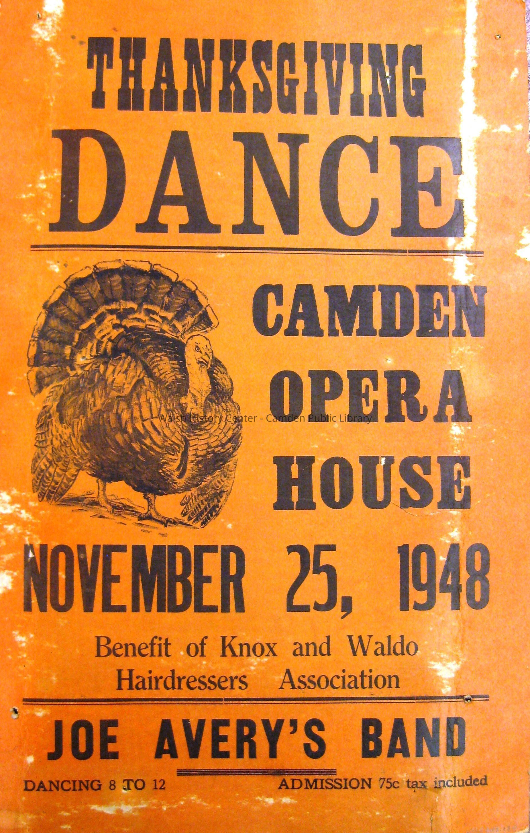 THANKSGIVING DANCE NOVEMBER 25, 1948 BENEFIT OF KNOX & WALDO HAIRDRESSERS ASSOCIATION WITH JOE AVERY'S BAND. Poster; black font on orange posterboard. Scuff damage and nail holes.Collection
