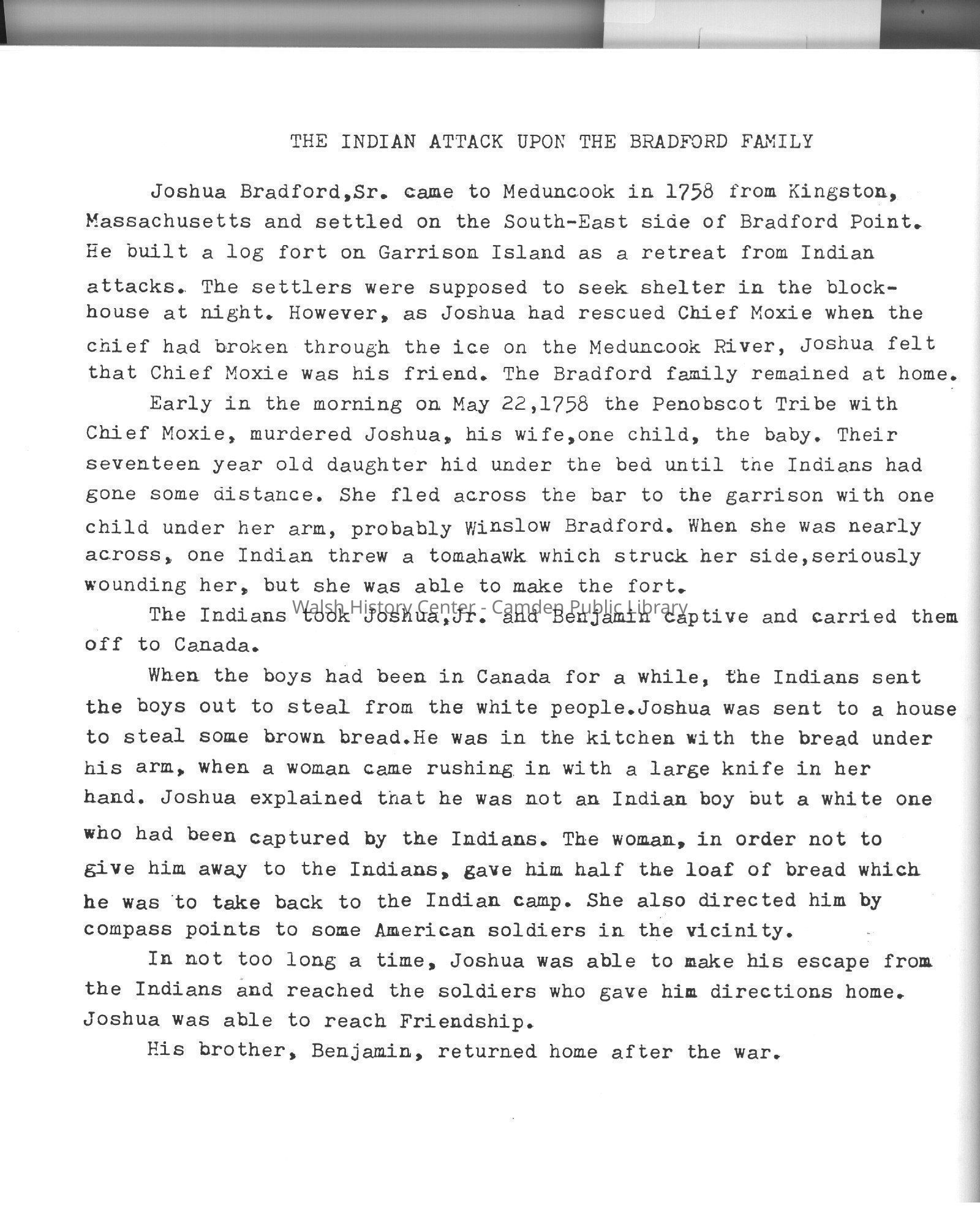 A history of the town of Friendship, Maine compiled from the notebooks of Dr. William Hahn. Includes postmasters, schools, vessels built at Morse Boat Shop, churches, noted citizens, family genealogies, family homes, those serving during war time, and an accounting of surviving a shipwreck at sea.